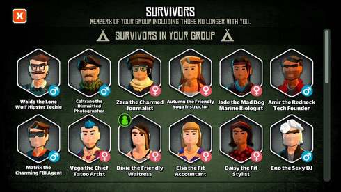 Alive 2 Survive: Tales from the Zombie Apocalypse предлагает выживать во время зомби-апокалипсиса. Пользователь выбирает персонажа, после чего пытается руководить группой выживших людей. Герои различаются именами и полом, а также 6 параметрами: лидерством, удачей, здоровьем, харизмой, умом, авторитетом. Они генерируются рандомно.