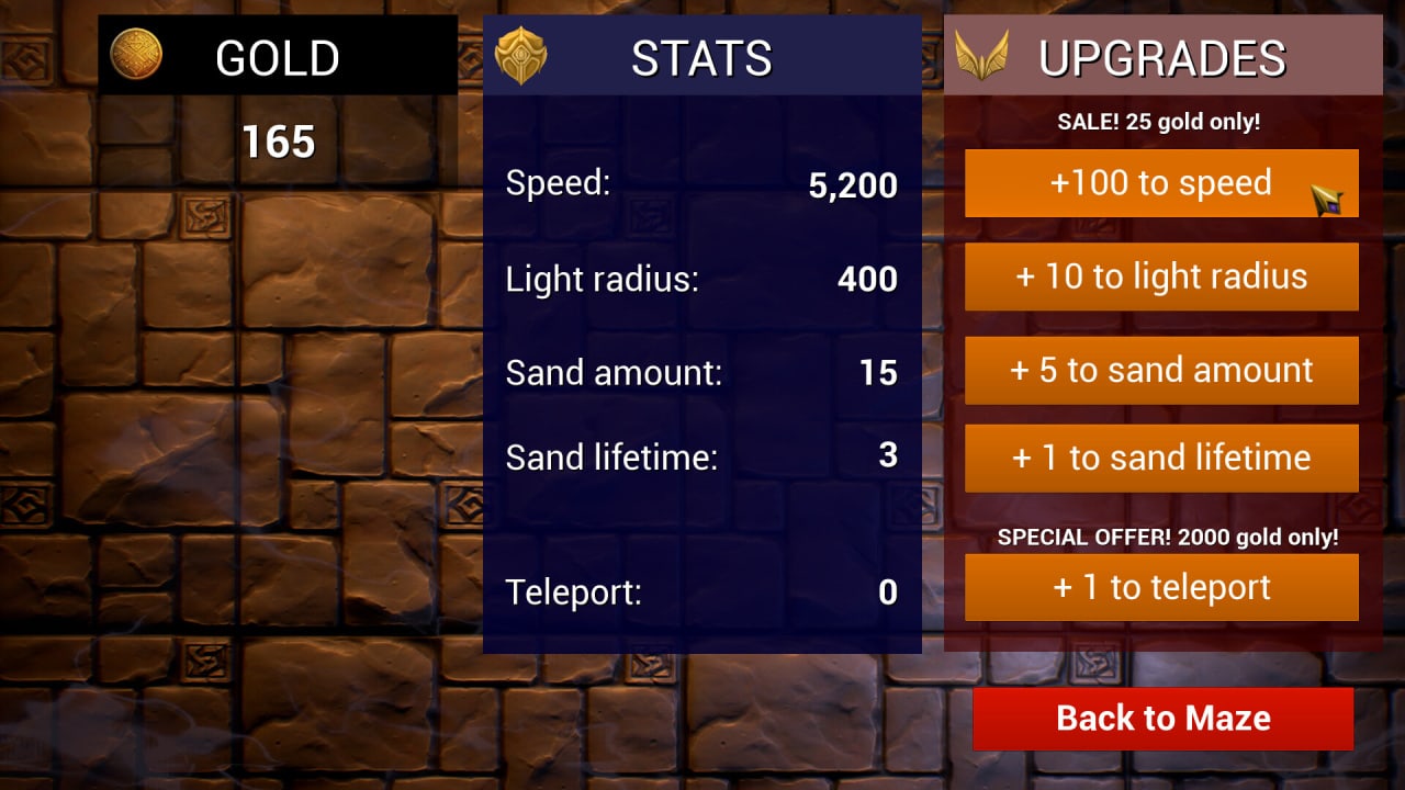 Упростить задачу помогут два улучшения - скорости бега и радиуса освещения, исходящего от героя. Чтобы прокачивать их, геймеру необходимо собирать разбросанные по коридорам золотые монеты. И тут всплывает еще одна сложность, ведь, чтобы активировать улучшение, необходимо вернуться ко входу. После смерти весь заработок и опыт останутся на земле, и придется начинать сначала. Кроме того, в самых отдаленных местах разбросаны записки, рассказывающие историю этого мира. Собрав их, можно заработать специальное достижение. Но опять же - этот элемент требует времени, которого у пользователя очень мало. Но и без этого, прохождение Maze Gold Run вряд ли можно назвать легкой прогулкой.