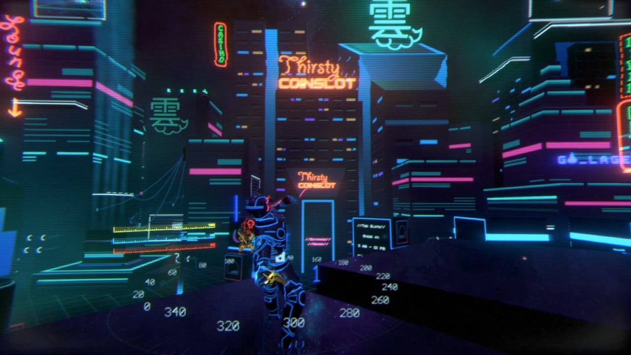 Надев специальный боевой костюм, появляется программный интерфейс, показывающий такие параметры, как жизнь, выносливость и т.д. Через него можно совершать сделки и покупать товар. Вспомогательные предметы нужны для наступательных и оборонительных целей. Сражаясь в стремительных боях, прокачивайте мастерство персонажа. Можно совершать рывки, приседать и скользить, словно ниндзя. На любые вспомогательные и стремительные действия затрачиваются очки выносливости (энергии). Можно отталкиваться от стен и прыгать между платформами.