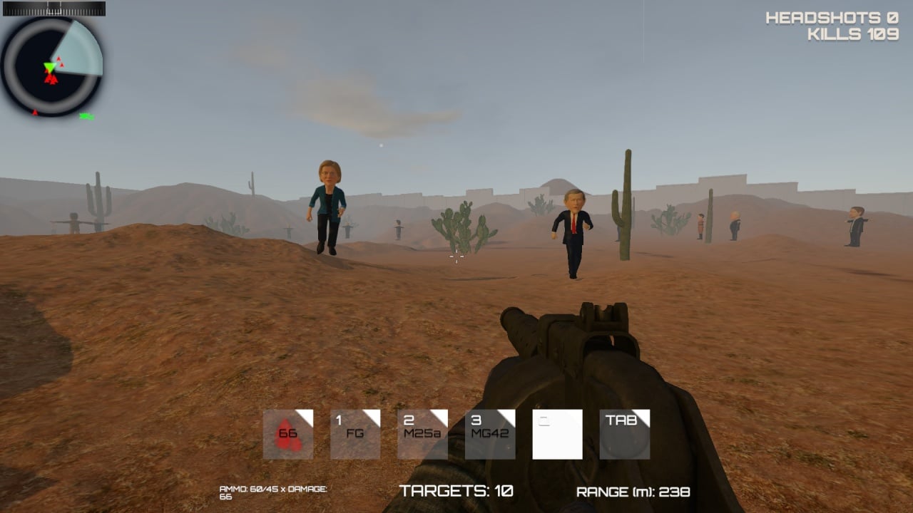 Как говорит сюжет игры, вам противостоит сам Дьявол, который предстает в обличиях политических деятелей. Он принимает самые разные формы, однако их объединяет лишь одно - вы хотите их убить. Одного лишь их внешнего облика хватит, чтобы вы моментально схватились за ствол и уничтожили Дьявола самым жестоким образом. События разворачиваются посреди пустыни, где в одной точке сошлись все беды человечества.