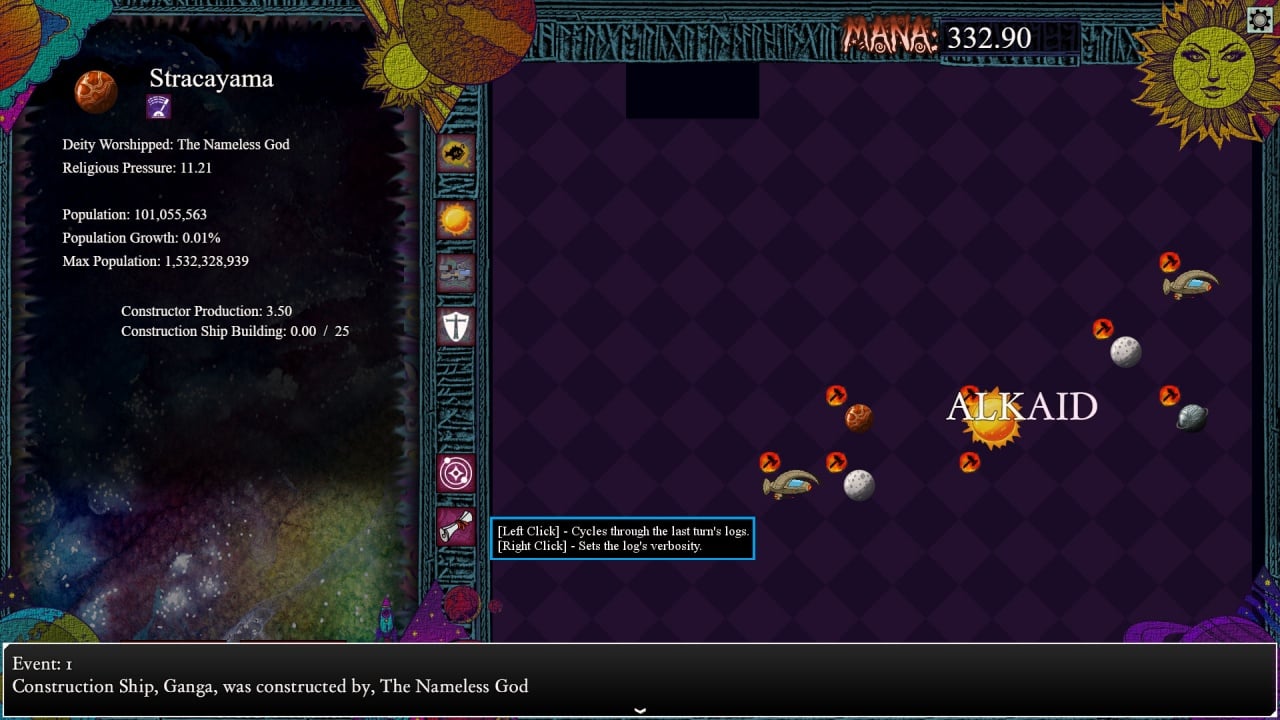 Люди вырабатывают ману – единственный ресурс в игре. Она пополняется с течением времени и ее количество зависит от численности населения в галактике. Эта стратегия основана на движке RPG-Maker. В основе игрового процесса Gods of Havoc: Into the Void лежат ходы. С каждым ходом проходит время и, соответственно накапливается мана. Если ее не хватает для сильного заклинания, пополнить ее можно только ускоряя ходы и ожидая нужного количества. Прохождение может показаться скучным, так как здесь минимум действий и часто приходится просто ждать. Также есть возможность перемотки событий при помощи режима Pass-Time. После этого в журнале появляется соответствующая запись. Иногда при новом запуске игра может подвисать и возникают проблемы с созданием большой карты. В таком случае для закрытия программы нужно воспользоваться диспетчером задач.