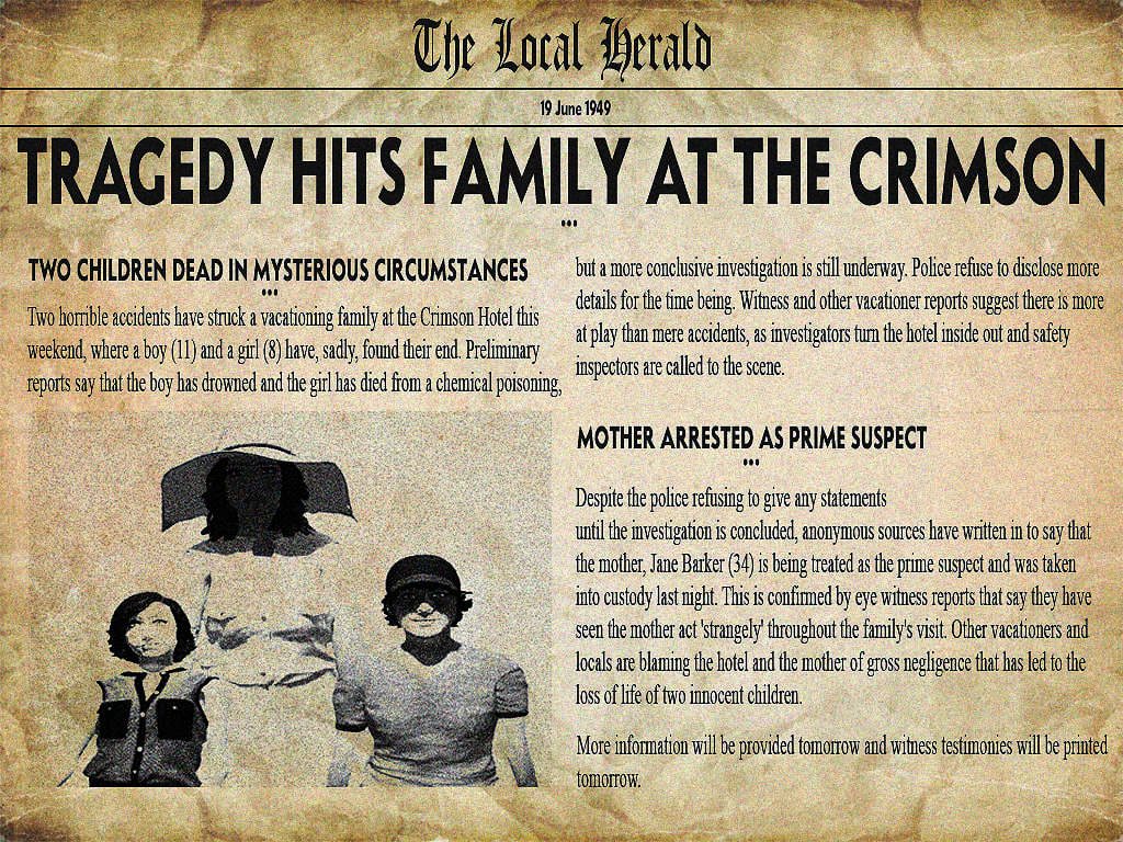 "Алый отель" был построен на месте старинного особняка, принадлежавший миллионеру Джею Блеквуду, а открылся для посетителей в 1880-тых годах. Несмотря на громадные вложения, бизнес шел плохо, а спустя 40 лет понадобилась реконструкция, после которой и начались странные события. Одна из семей, чета Баркеров, приехавшая на отдых, лишилась собственных детей из-за несчастного случая. Это был серьёзный удар по репутации отеля, хромавшего и до трагической смерти школьников. По версии следствия, главная подозреваемая – мать этих детей, её зовут Джейн. Вот только существует легенда, что она настолько зла и переполнена местью, что до сих пор находится внутри здания и жаждет убивать.