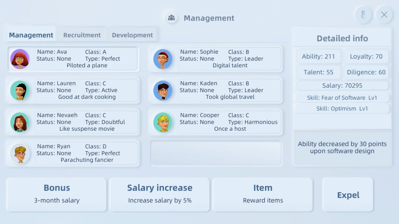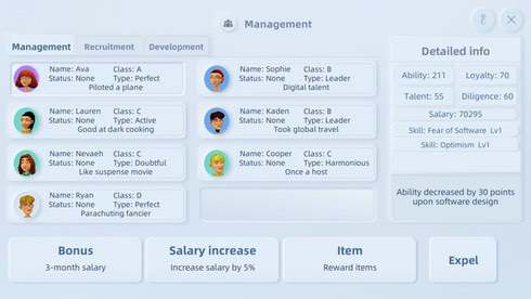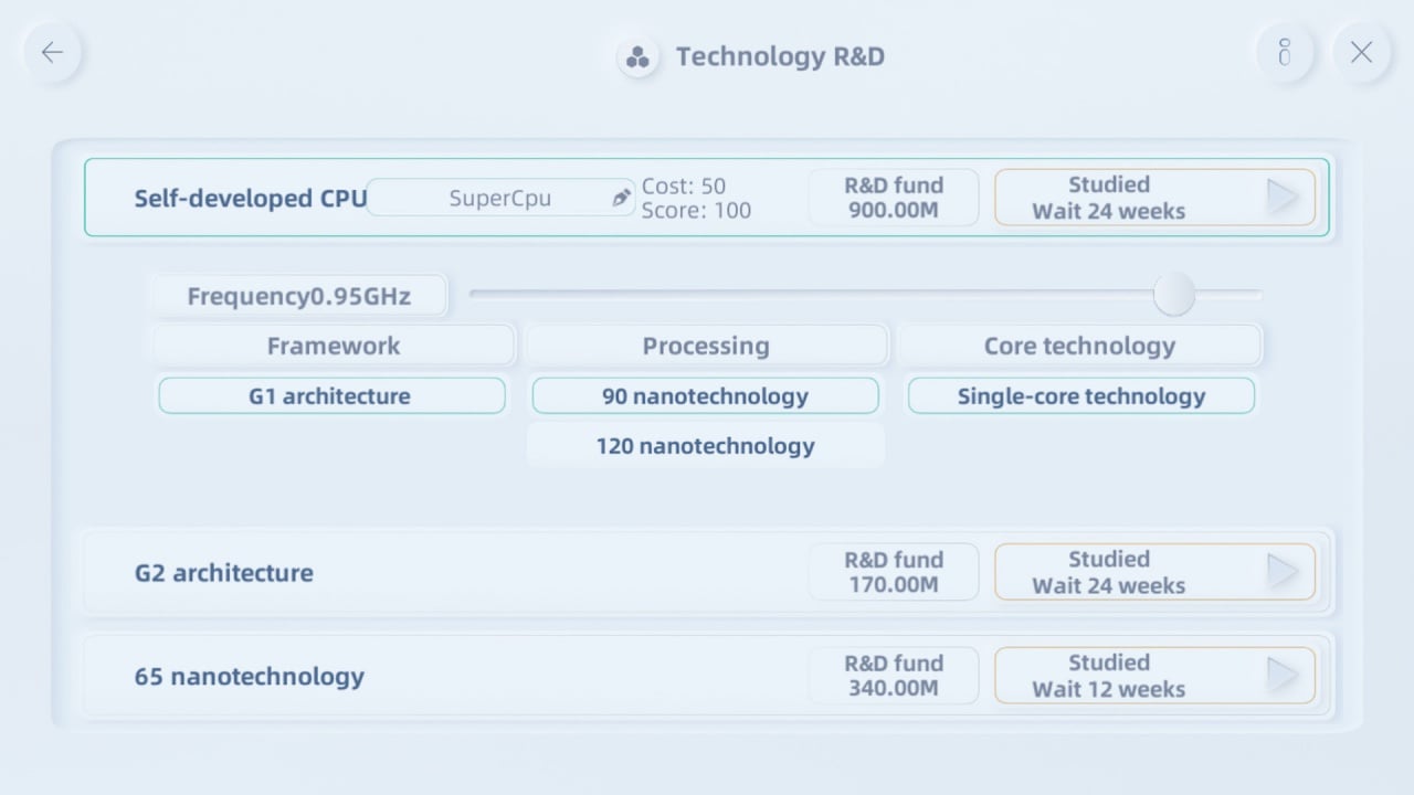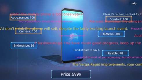 Конструирование продукта разделено на несколько этапов, один из которых - создание схематического рисунка. Одновременно с этим есть опция выставления характеристик устройства, такие как вес, комфортабельность использования, и прочее. Когда прототип утвержден и работа по его созданию входит в активную фазу, сотрудники находятся в офисе, а над их головами отображаются разные элементы, показывающие, что робота кипит. Работоспособность каждого члена команды отображается в динамическом графике. Тех, кто будет подавать больше креативных идей или давать верные советы, можно повышать. Со временем, в более продвинутые модели можно будет имплементировать камеры (как стандартные, так и фронтальные), и этот параметр также настраивается.