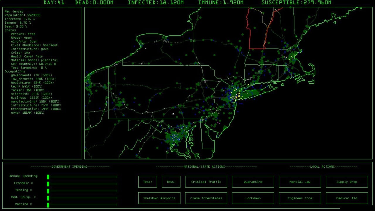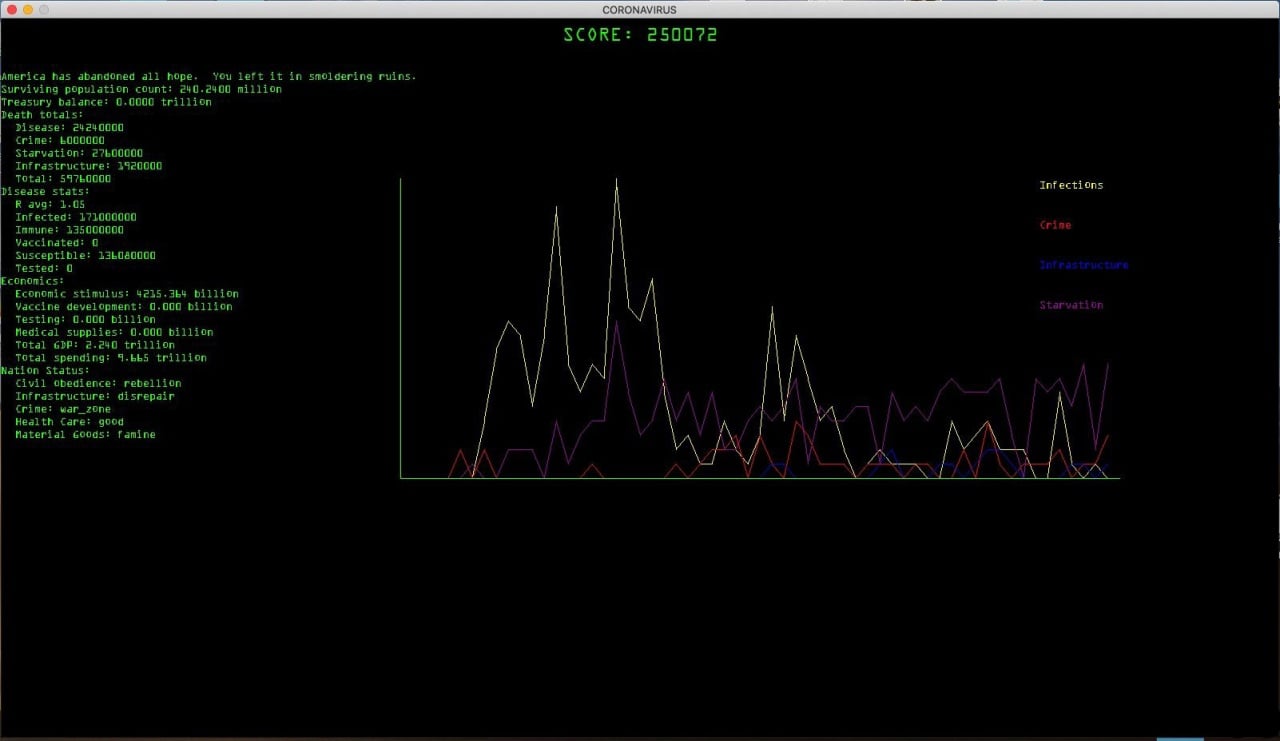 Coronavirus 1.0 v Build 09.10.2020 Новая версия Полная версия Последняя Дата выхода 2020 Разработчик bladernnr Жанр Стратегии, Симуляторы Обновлено 26 января 2025, 06:39 Список изменений В Coronavirus 1.0 действовать придется в условиях пандемии, выступая в качестве высокопоставленного лица одного из государств, которое пытается минимизировать возможный ущерб для людей и экономики. В симуляторе правительства США игрок оказывается в центре вспышки коронавируса и решает судьбу всего народа. Здесь предстоит управлять экономической сферой, пытаясь подобрать разные способы преодоления вируса, а также для спасения людей. Любое предпринятое пользователем действие приносит свои последствия, поэтому необходимо взвешивать каждый шаг. В симуляторе американского правительства геймер должен попытаться спасти подконтрольную страну от пандемии, которая внезапно на нее обрушилась. Здесь важно заботиться о разных аспектах жизни державы, чтобы даже после преодоления коронавируса ей был нанесен минимальный ущерб. Например, если закрыть на карантин большее число населения, то очень быстро экономическая жизнь государства пойдет на спад, перекрытые дороги приводят к голоду, долгая изоляция - к массовым восстаниям, а слишком много больных становятся причиной возрастания преступности и даже, возможно, потери власти. В процессе юзеру предстоит принимать еще немало подобных сложных решений, постоянно взвешивая каждый шаг, ведь одно неверное действие приводит к необратимым последствиям. Здесь действует реалистичная модель распространения вируса, где под учет взят размер территории, плотность населения, инфраструктура и экономика. По мере продвижения геймер зарабатывает баллы, постоянно придумывая новые работоспособные схемы для выполнения миссии. Скачать торрент Скриншоты Скачать Coronavirus 1.0 Тип релиза Пиратка (Таблетка: Не Требуется) Версия v Build 09.10.2020 (Полная) Последняя Размер 277 МБ Интерфейс Английский Озвучка Отсутствует Скачать .torrent торрент файл Скачать БЕЗ торрента прямая ссылка через uTorria Системные требования ОС: XP, Vista, 7, 8, 10 Процессор: Dual Core 2.0 GHz Оперативная память: 1.5 ГБ Видеокарта: HD Graphics 4000