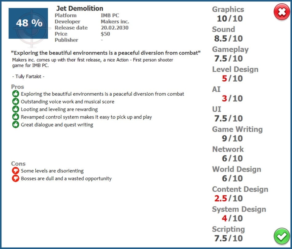 GamersGoMakers RUS v 1.1.7 Новая версия Полная версия Последняя Дата выхода 8 авг. 2014 Разработчик gnifrebel Games UG Жанр Симуляторы, Инди, Стратегии В основном положительные на основе 300 обзоров в Steam 78% Обновлено 26 января 2025, 06:56 Список изменений В GamersGoMakers пользователь примет роль руководителя компании, создавшей первые в мире видео игры. Он - первопроходец в этой сфере, и его первый проект, созданный в далеком 1980-м году, основывается лишь на сочетании звуковых эффектов и примитивной графики. Ему приходится занимать все возможные должности (дизайнера, композитора, продюсера, художника и прочие), так как команда еще не собрана. При этом, у него есть полная свобода действий по части задумок сюжета, концепций геймплея и прочего. После введения стартовых настроек (уровень сложности и временные рамки), GamersGoMakers предложит выбрать 3 из 8 имеющихся отраслей, в которых игрок может повысить уровень мастерства. Это звук, графика, контент-дизайн, звуковой дизайн, дизайн уровней и прочее. Далее, следует выбрать страну, в которой будет базироваться персонаж. Это важно, так как в зависимости от того, что в итоге выберет пользователь, один из вышеупомянутых компонентов (например, дизайн) немного возрастет. При непосредственном создании проекта главными критериями станут жанр и платформа, для которой разрабатывается игра. Это могут быть как модели компьютеров, доступные в то время, так и консоли. В дальнейшем, при продвижении продукта и его рекламе, можно выбрать языки, на которые его переведут, а также категории, через которые его можно рекламировать. С самого начала, у персонажа будет лишь 1 офис для работы, но в дальнейшем появится возможность заиметь до 16 помещений, отведенных для конкретных отделов. За увеличением масштабов работы последует и увеличение штата, поэтому каждому сотруднику следует выделить определенную сумму на зарплаты, премии, отпуска и прочие нужды. Если проекты станут сверхуспешными, разработчика представят к награде, а также предложат посетить ряд тематических конференций. Так или иначе, количество активностей возрастет, и придется решать несколько вопросов одновременно. Скачать торрент Скриншоты Показать больше Видео из игры Скачать GamersGoMakers Тип релиза Пиратка (Таблетка: Не Требуется) Версия v 1.1.7 (Полная) Последняя Размер 106.7 МБ Интерфейс Русский Озвучка Отсутствует Установка: Скачать .torrent торрент файл Скачать БЕЗ торрента прямая ссылка через uTorria Системные требования ОС: Windows XP, 7, 8, 10 Процессор: 2.0 GHz Dual Core Оперативная память: 1 GB Видеокарта: Hardware Accelerated Graphics with dedicated memory Место на диске: 150 МБ Менеджмент, Казуальная, Экономика