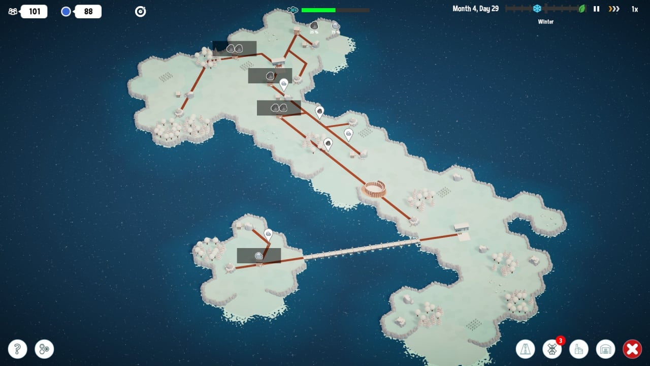 Устанавливайте дорожную сеть и связи между зданиями. Рабочий мегаполис способствует процветанию торговых путей и увеличению сырья, научная ветка позволяет получать новые задания и миссии. В зависимости от сезона меняет климат, а также спрос на тот или иной товар. Из-за погоды некоторые ресурсы могут оказаться в дефиците или вовсе недоступны.
