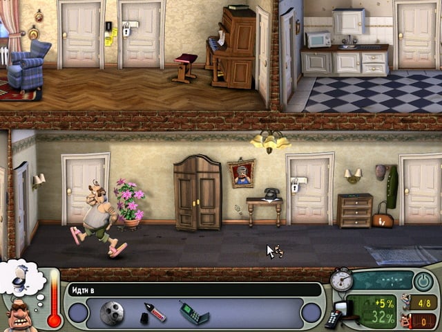 От проделок мужчина выходит из себя, и у него растет индикатор злости. Чем лучше антигерой портит нервы своей жертве, тем выше его рейтинг. В награду он получает доступ к новым уровням и разные статуэтки. Всего в игре 14 эпизодов. Они разбиты на 3 сезона. Также имеются три пилотных выпуска. Это обучающие этапы. Уровни проходятся на время. Присутствует возможность отключить таймер при желании. Протагонист может передвигаться обычным шагом и красться, а также взаимодействовать с окружениям. Ему надо постоянно прятаться от хозяина дома. Если тот его увидит, то побьет. В комнатах порой встречается собака или попугай. Мимо домашних животных приходится ходить на цыпочках, чтобы не спровоцировать шум. При этом можно специально шуметь при них, чтобы привлечь внимание тучного мужчины в те моменты, когда надо отвлечь его.