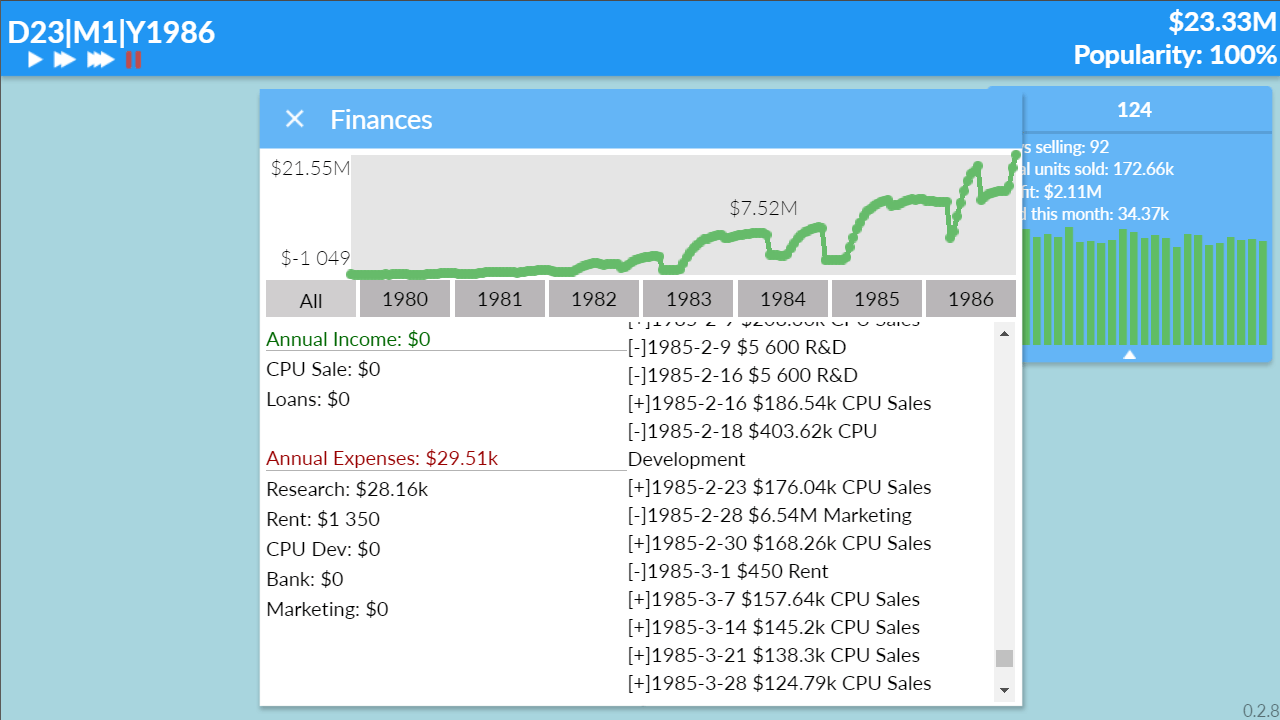 Hardware Tycoon v 0.2.12 Новая версия Ранний Доступ Последняя версия Дата выхода 2018 Разработчик Haxor Жанр Инди, Стратегии, Симуляторы Обновлено 19 мая 2025, 08:45 Список изменений Hardware Tycoon дает возможность ощутить себя предпринимателем. Геймер является владельцем собственной организации, которая производит детали для компьютерной техники. Придется разрабатывать новые технологии, чтобы быть топовым лидером на рынке. Придется тестировать и находить новые компоненты, соревноваться со своими конкурентами, а также делать что-то уникальное. Перед игроком представлены различные списки, таблицы, графики и диаграммы. Требуется все возможное, чтобы совершить прорыв в этой индустрии и повысить значение собственной фирмы. Перед началом в Hardware Tycoon необходимо выбрать один из 4-х видов сложности: "Легкий", "Средний", "Тяжелый" или "Очень трудный". После этого для своего бизнеса необходимо придумать название, а также имя директора. Требуется не просто продавать готовую продукцию или программы, а понимать тренды и тенденции, которые делают этот рынок. От владельца компании потребуется максимум сосредоточенности, чтобы можно было развивать данную отрасль, продавая детали. Сами события разворачиваются в 70-х годах прошлого столетия. Однокомнатное помещение будет служить начальным офисом. Придется начать с малого, чтобы добраться до вершин. Первоначальный капитал составляет 50 тысяч игровых долларов. Время идет так, как этого хочет геймер. Можно ускорять или наоборот замедлять, чтобы лучше проработать схему реализации. Устанавливать конечные цены, собирать множество компонентов будет главный герой. Скачать торрент Скриншоты Показать больше Видео из игры Скачать Hardware Tycoon Ранний доступ Тип релиза Пиратка (Таблетка: Не требуется) Версия v 0.2.12 (Полная) Последняя Размер 139.3 МБ Интерфейс Английский Озвучка Отсутствует Установка: Скачать .torrent торрент файл Скачать БЕЗ торрента прямая ссылка через uTorria Системные требования ОС: Windows 7, 8, 10 Процессор: 2 GHz - Dual Core Оперативная память: 1 ГБ Видеокарта: 256 МБ