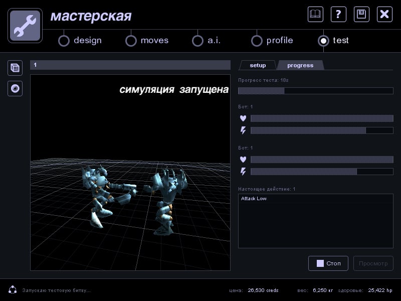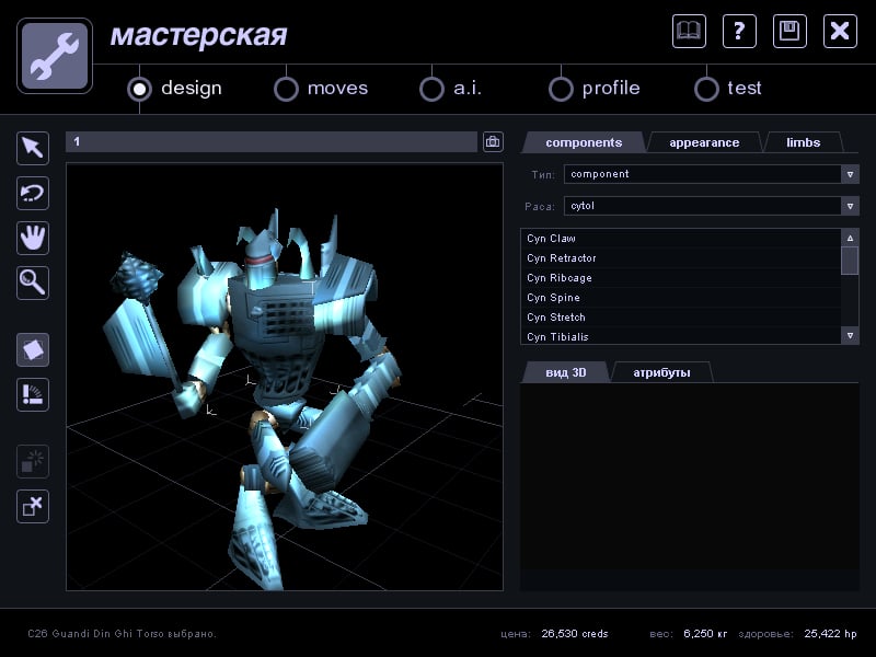 Доступно огромное количество разнообразных запчастей и модулей, из которых игрок сам конструирует боевого робота. Можно создать массивного колосса, отличающегося медленными, но сокрушительным действиями, либо маленького, но проворного бойца, наносящего серию ударов и т.д. Редактор Roboforge очень интуитивный и простой. Выберите область, которую хотите создать и перебирайте модули, которые больше соответствуют вашему бойцу.