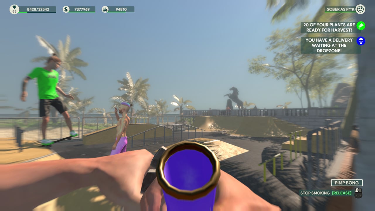 Помимо продвижения своего магазина предстоит участвовать в экшен-миссиях от первого лица и следовать по сумасшедшему сюжету. Центральный персонаж переживает не лучшие момента, особенно после кражи его Камаро. На пляже он встречается со знакомым и таинственным человеком, который готов помочь добиться успеха. Единственное условие – лишняя почка протагониста. После этого он начинает зарабатывать деньги, продавая марихуану на законных основаниях.