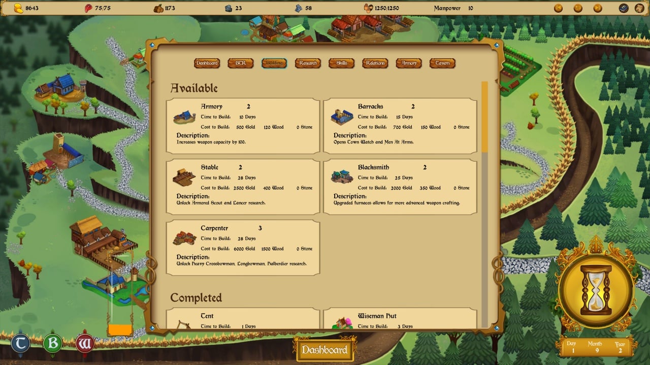- Прохождение начинается с нуля. Требуется устанавливать жилые и производственные здания. Через время пустая земля превратится в процветающее королевство или сожженную местность.