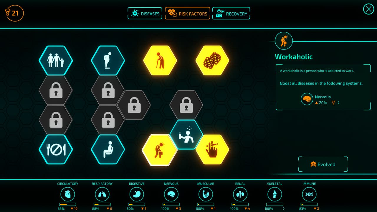 Играйте в сюжетный режим за настоящего героя – медика, вылечивая людей от болезней. Потребуется сначала диагностировать болезнь, а после найти лекарство. Каждое последующее задание будет усложняться. Либо исследуйте темную сторону и постарайтесь сделать по-настоящему зловещую болезнь. Преодолевайте препятствия, например, иммунитет, вакцины и разрабатывайте улучшенные смертельные болезни.