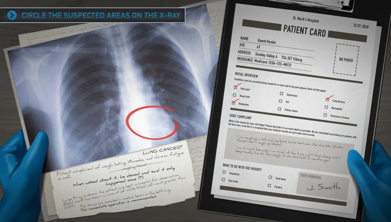 Перед глазами всегда доступна история пациента. Можно почитать специальную литературу, чтобы окончательно убедиться в правильности принятых решений. Сопоставляя симптомы, анализы и изучая историю болезни, можно самолично прокачаться в медицинских познаниях. Смерть в Doctor Simulator неизбежна. Всегда предстоит отчитываться перед родными. Они паникуют, не соглашаются, противятся и кричат. Никогда не знаешь, какая реакция может последовать от семьи пациента. Получая деньги, необходимо закупаться новым оборудованием, обучать или нанимать врачеей, а также убедиться в том, что учреждение хорошо финансируется и может считаться одной из лучших клиник в стране.