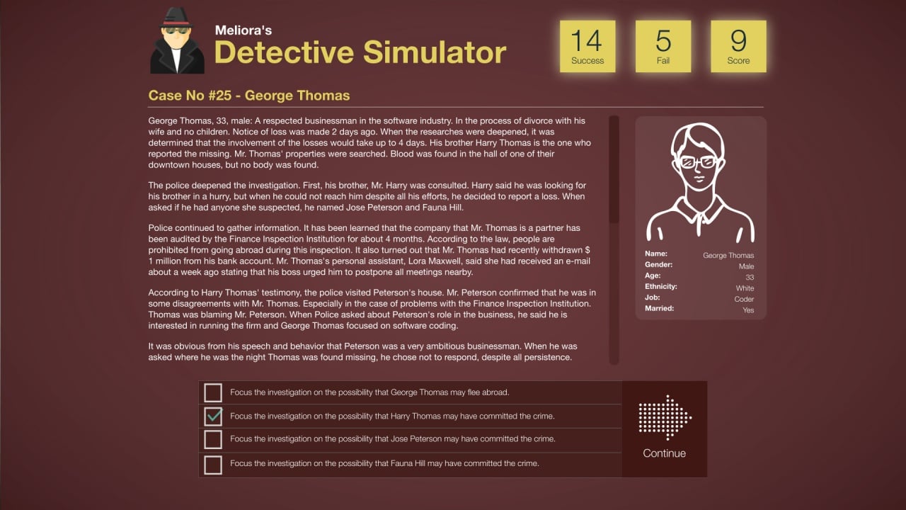 Meliora's Detective Simulator - детективный симулятор, представляющий собой текстовое приключение, фокусирующееся на жизни частного сыщика. За время прохождения предстоит ознакомиться со множеством криминальных историй, изучать улики, искать доказательства и многое другое. Важно лишь найти способ выйти на преступника и раскрыть детали преступления.