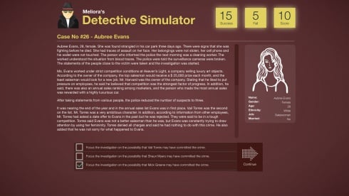 Игровой процесс выполнен в духе старой школы, однако при этом соединяющий механики олдскульных текстовых приключений с современным элементами и жанрами, включая RPG, симулятор, визуальную новеллу и т.д. Выбрав задание, которое собираетесь раскрыть, необходимо изучить всю доступную информацию.