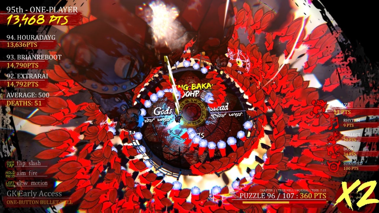 Разработчики объединили в геймплее аркаду, ретро, шутер и ритмический процесс. Протагонист побывает в аду Данте и на филиппинских ужасах. На пути он столкнется с разными соперниками с оригинальной характеристикой и будет противостоять им. У геймера лишь одна задача – остаться в живых, перемещаясь под градом пуль. В проекте потребуется пользоваться единственной кнопкой, чтобы атаковать, снижать скорость, совершать длительные атаки или выполнять развороты.