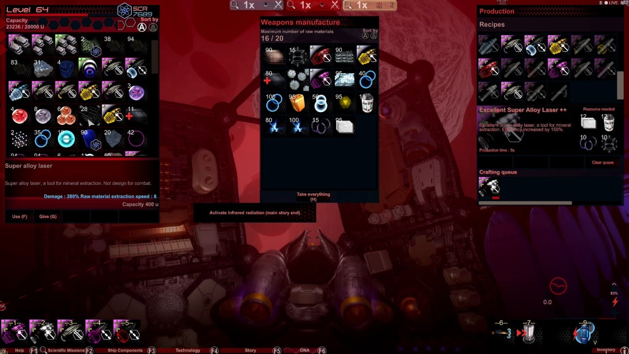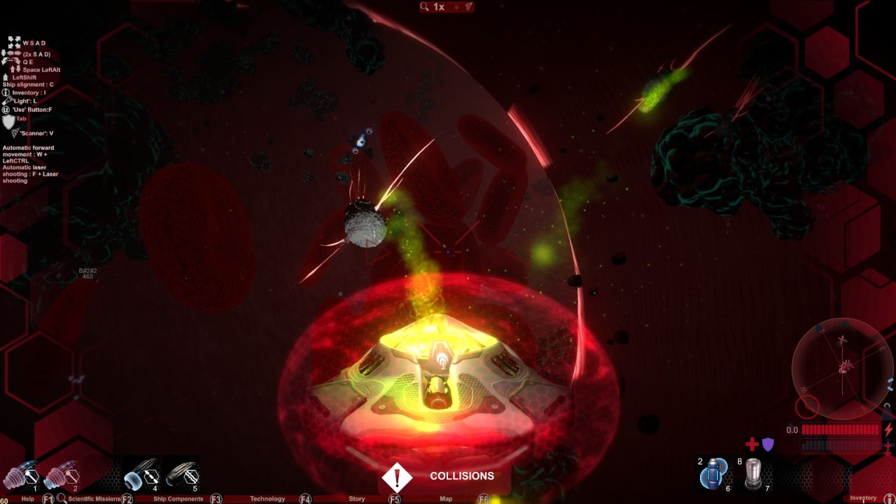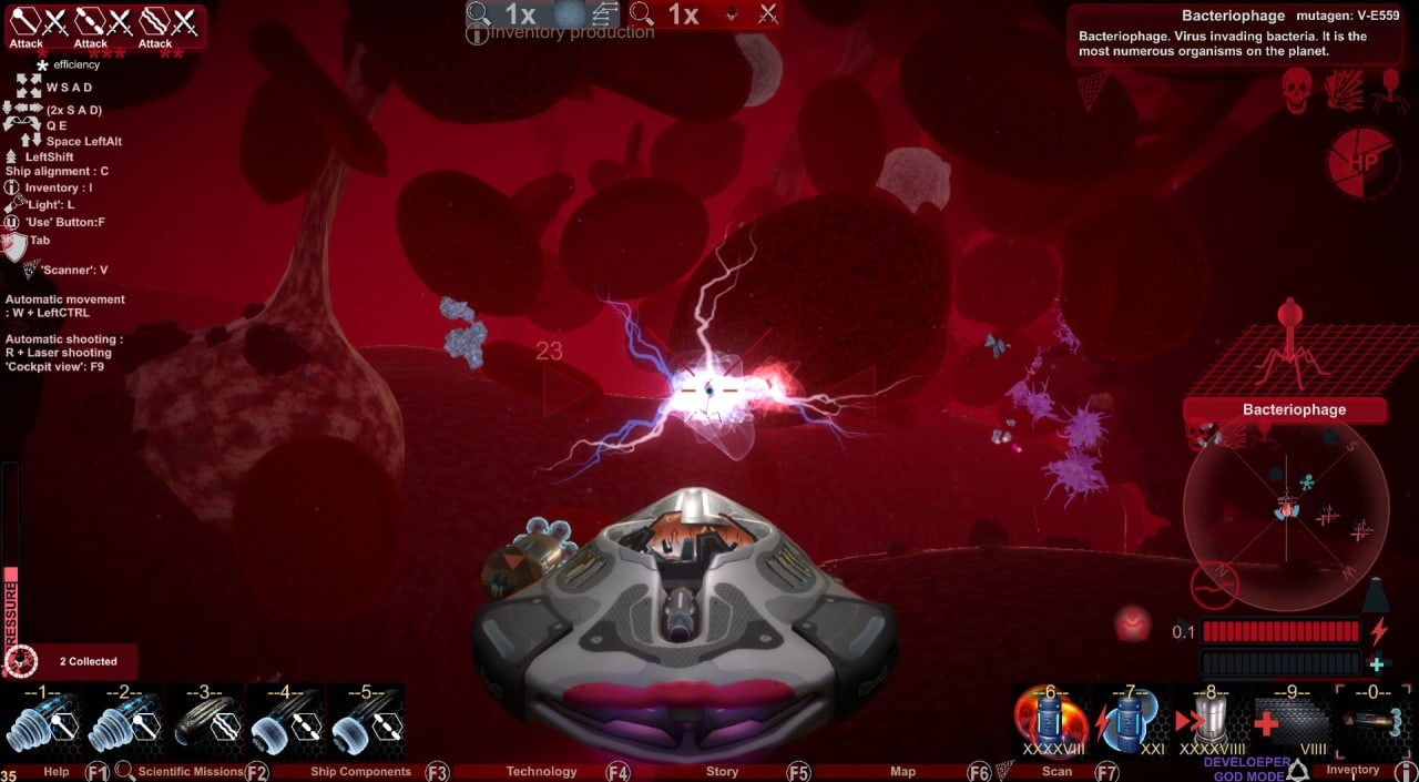 Корабль нуждается в воздухе и топливе, чтобы системы исправно работали. Мертвые микробы или кровь позволяет добывать ресурсы и минералы. Юзер способен создавать щиты, двигатели, лазеры, вооружение и компоненты для флота. Обновляя программное обеспечение судна, можно повысить скорость и уменьшить потребление энергии. Пациент быстро умирает, а центральному персонажу понадобится выяснить, из-за чего лекарство от рака плохо действует.