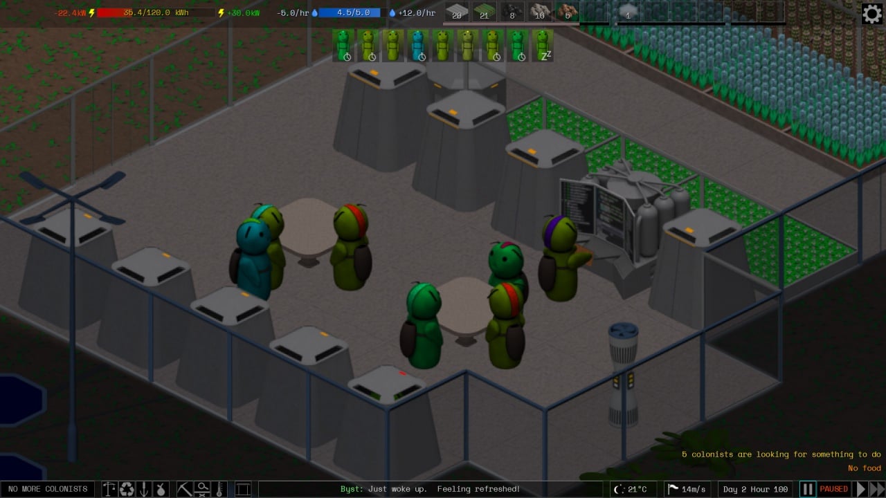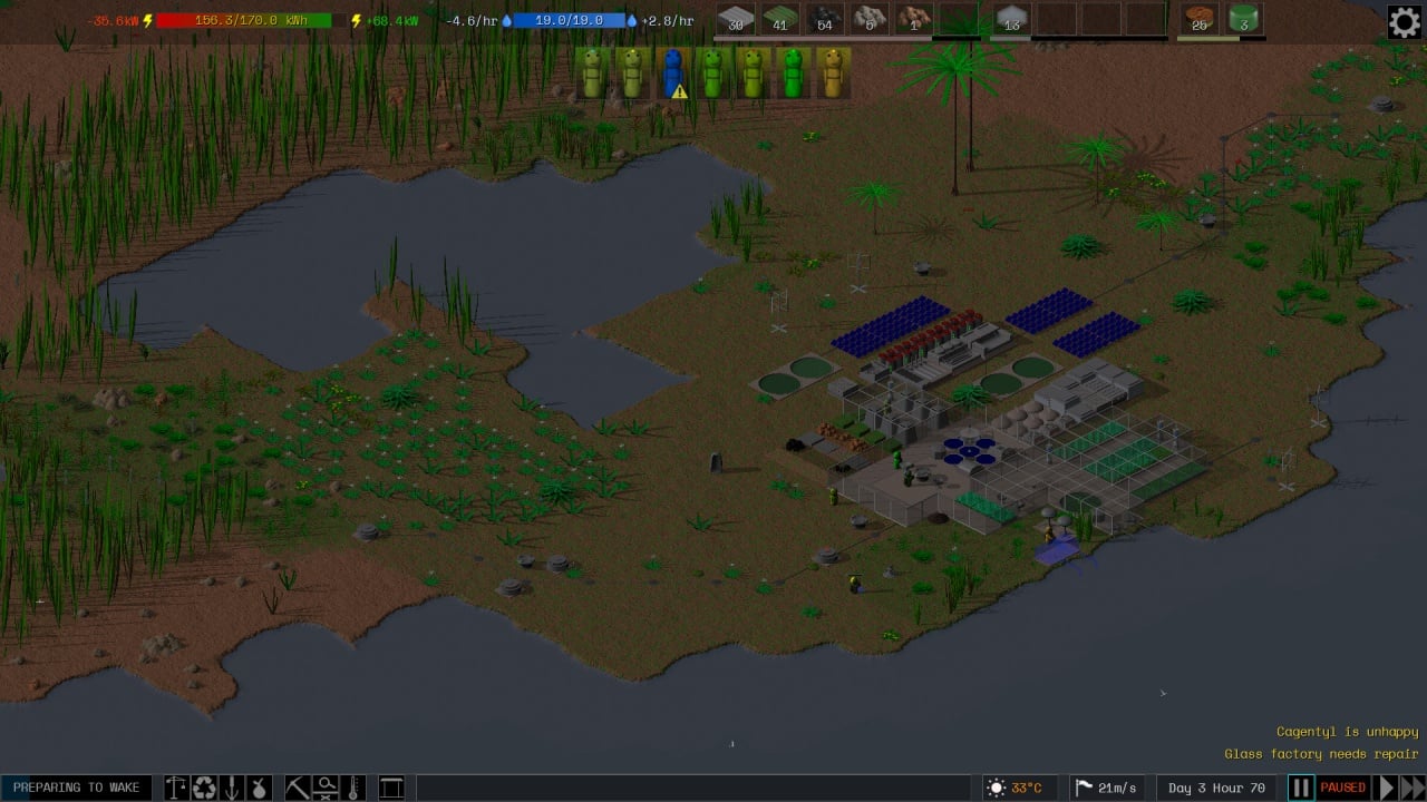 Игроку предстоит управлять углем, камнем, рудой и органикой. На старте развития необходимы камни и растительность, но постепенно потребуется добираться до драгоценных материалов. Подопечным нужна еда, а питательная смесь наносит ущерб счастью персонажей, хоть и легко производится. В новом мире множество съедобных и ядовитых плодов. Ботаники будут их собирать и дегустировать, чтобы выявлять лучшие виды. Инструменты помогут вспахать землю и посадить культуры.