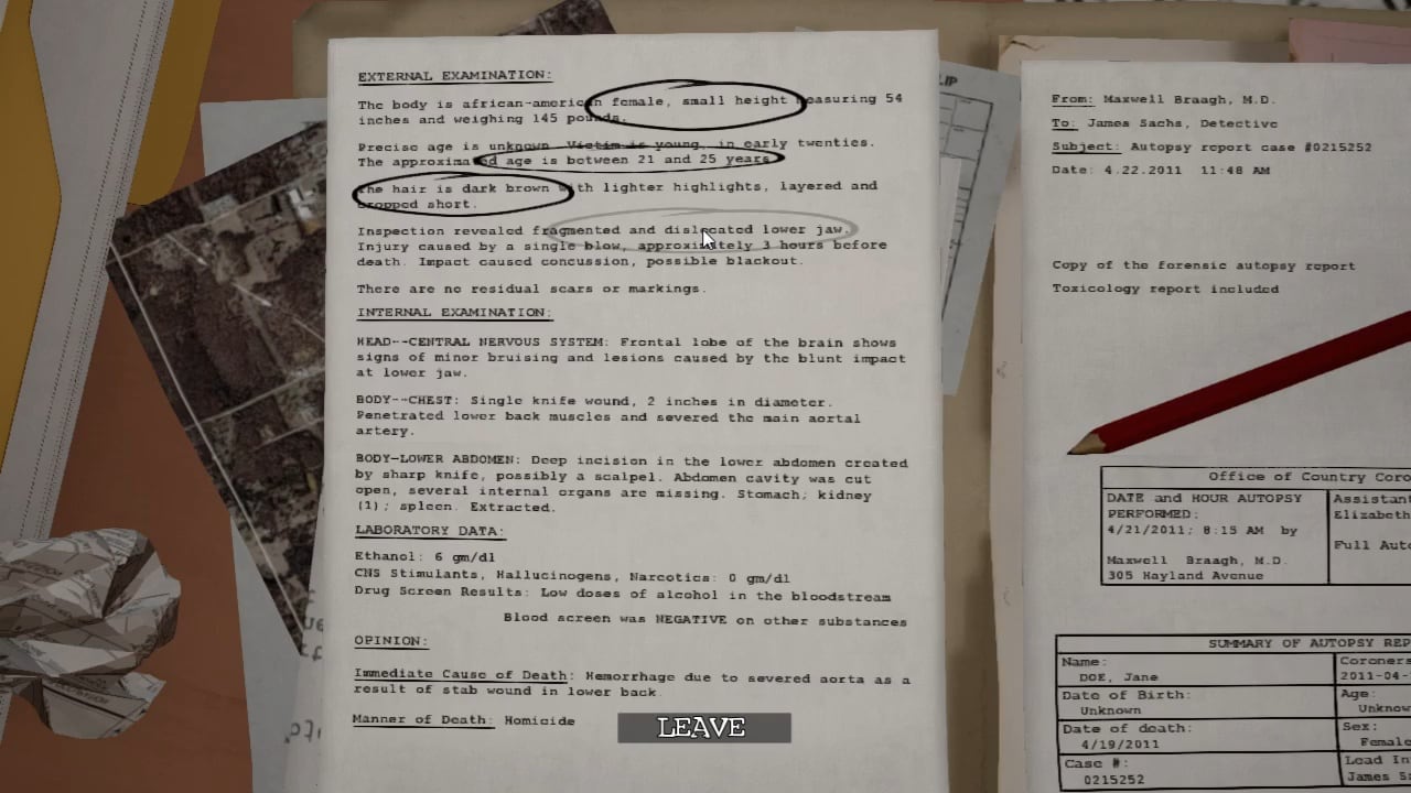 Действие начинается в квартире главного персонажа. Взаимодействовать можно только с теми предметами и объектами, которые помогут продвинуться по сюжету. Если взять в руки не ту вещь, сделать неверное предположение или проигнорировать миссию, экран затемнится и придется начинать расследование заново. В самом начале нужно найти папку с документами о ходе расследования и выяснить некоторые особенности дела. Например, медкарты обеих жертв содержат информацию о странных совпадениях, пропавших частях тела, небольшом алкогольном опьянении и содержании наркотиков в крови убитых.