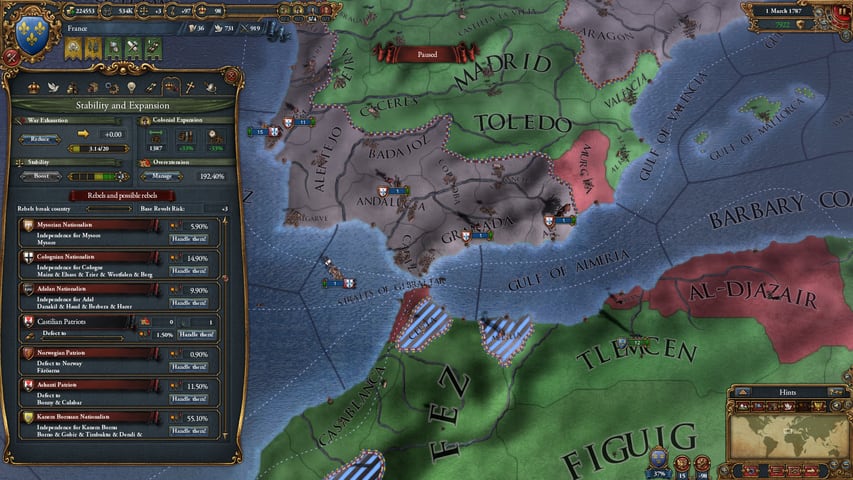 Огромную роль играет фактор случайности. Все события генерируются случайным методом. Позволяется развивать передовые технологии. Они делятся на три типа: административные, дипломатические и военные. Каждая из них направлена на улучшение того или иного аспекта в жизни своей страны. В зависимости от ветки развития, нация получает различные бонусы и бусты, определяющие стиль игры.