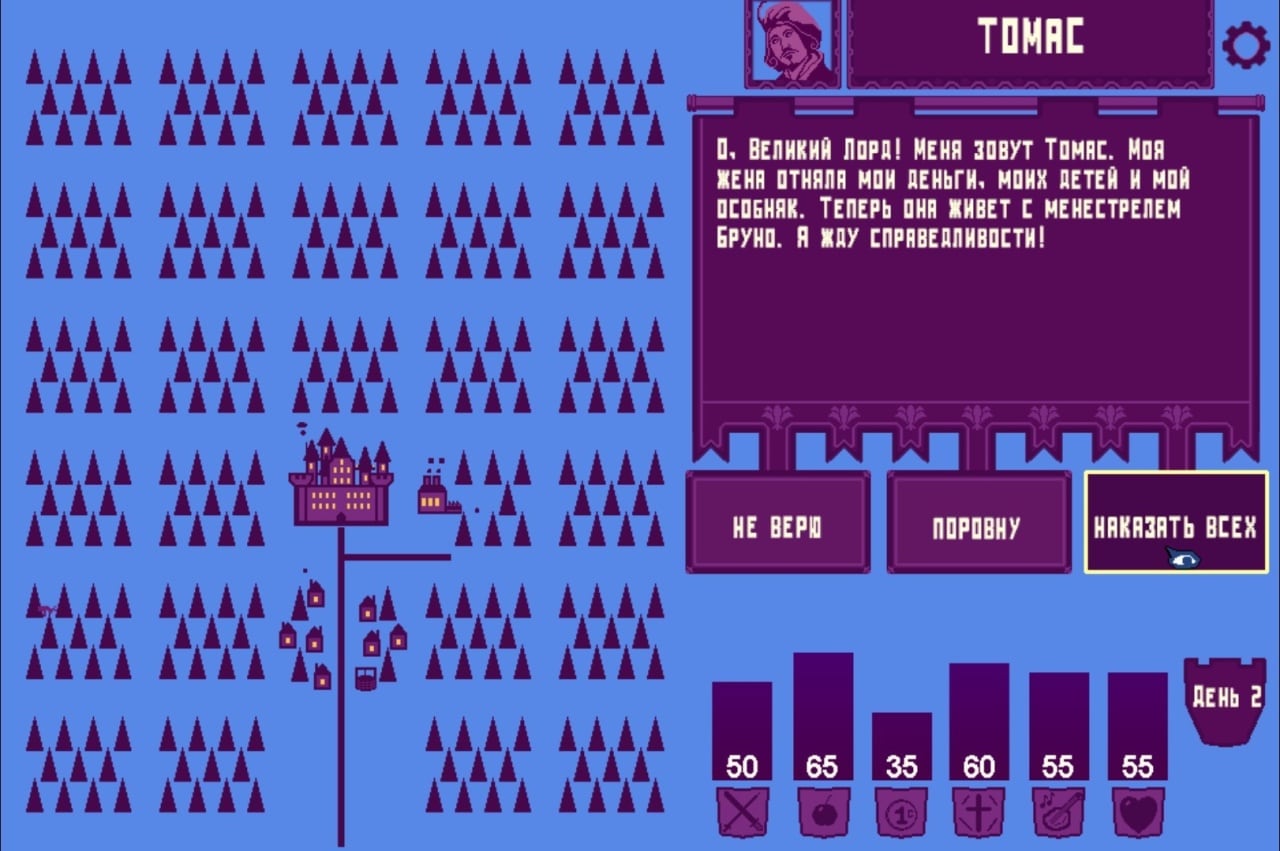 KingSim RUS v 2.08 Новая версия Полная версия Последняя Дата выхода 28 мая. 2020 Разработчик Fuzzy Pixel Game Studio Жанр Симуляторы, RPG, Стратегии, Приключения, Инди Очень положительные на основе 183 обзоров в Steam 84% Обновлено 26 января 2025, 12:00 Список изменений KingSim – это симулятор короля и политическая стратегия. Видеоигра дает возможность руководить маленьким королевством. Инди-проект использует средневековый сеттинг. Тайтл содержит в себе много юмора. У KingSim вариативный геймплей. Он завязан на необходимости принимать решения и сталкиваться с последствиями выбора, в том числе и с далеко идущими. Они порой отображаются ещё и визуально на карте. Однако большая часть информации подается в текстовой форме. У проекта высокая реиграбельность. После прохождения основной кампании открывается "новая игра плюс" с дополнительным контентом. Смысл игры состоит в том, чтобы постараться как можно дольше продержаться на престоле. Нужно распределять ресурсы, улучшать экономику, наращивать мощь войска, расширять территорию, возводить или апрейдить оборонительные сооружения, готовиться к военным конфликтам, решать внутриполитические проблемы и так далее. Ресурсов здесь 6 разновидностей: золото, вера, еда, здоровье, счастье и армия. Можно подыскать себе жену, назначить кого-нибудь из подданных на роль шута и всё в таком духе. Некоторые из опрометчивых решений могут привести к смерти правителя различными способами. Помимо этого есть разнообразные мини-игры. Геймерам позволяют обыгрывать принцесс в кости, отправлять шахтеров на добычу драгоценных металлов, руководить дровосеками и участвовать в других небольших забавах. Скачать торрент Скриншоты Видео из игры Скачать KingSim Тип релиза Пиратка (Таблетка: Не требуется) Версия v 2.08 (Полная) Последняя Размер 157.9 МБ Интерфейс Русский Озвучка Отсутствует Установка: Скачать .torrent торрент файл Скачать БЕЗ торрента прямая ссылка через uTorria Системные требования ОС: Windows 7, 8, 10 Процессор: Intel Core 2 2.0Ghz Оперативная память: 2 ГБ Видеокарта: Intel HD 3000 Место на диске: 500 МБ Ролевые стратегии, Выбери себе приключение, Менеджмент, Средневековье, Решения с последствиями, Несколько концовок, Глубокий сюжет, Политический симулятор, Градостроение, Пиксельная графика, Чёрный юмор, Управление ресурсами, Историческая, Игры в 2D