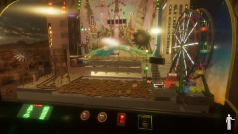 Пользователь выбирает режим, меняющий основную цель, а после перемещается к игровому автомату. Потребуется взаимодействовать с частями на устройстве и толкать монеты. Сверху на счетчике указано, сколько денег было выиграно, брошено и потеряно. Два рычага будут отталкивать объекты, а те попадать в разные части на области. За счет этого выходит определенный счет и количество победных очков.