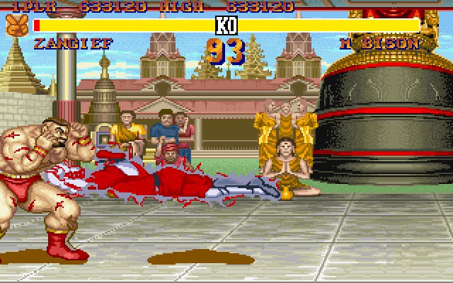 Каждое столкновение в "Стрит Файтер" состоит из трех раундов, где потребуется победить оппонента за 30 секунд. Если время заканчивается, а оба участника стоят на ногах, то выигрывает тот, кто остался с наибольшим количеством здоровья. Геймер наблюдает за персонажем сбоку. Если в сюжетной кампании проиграть ИИ, то потребуется сражаться с ним до тех пор, пока не удастся выиграть. Подопечный способен перемещаться назад относительно оппонента, прыгать, приседать и атаковать. Комбинируя клавиши, создаются специальные приемы. Если атаковать во время прыжка, то можно попасть в голову соперника и нанести больше урона.