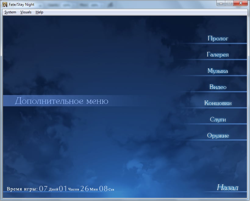 Fate/stay night - визуальная новелла по мотивам одноименного аниме-сериала Судьба Ночь Схватки. Геймплей выделяется повышенной степенью интерактивности. В основном игровой процесс протекает при помощи статичных двухмерных изображений. Игроки читают текст и выбирают реплики ответов. Решения приводят к различным сюжетным поворотом и последствиям.