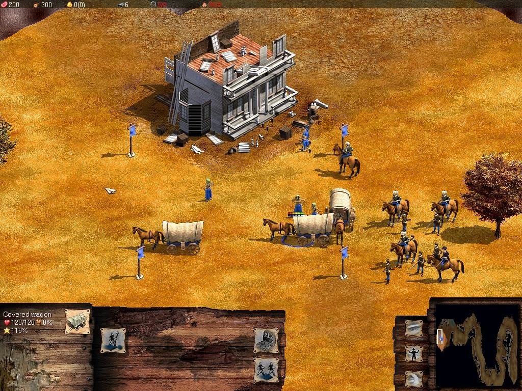 Если построить ранчо, то откроется возможность содержать более 80 единиц пищи. Кампании представлены заданиями по 6-8 миссий каждая. Все 4 сценария различаются между собой и содержат уникальные механики. Особый интерес представляет игра за бандитов. Они ничего не производят. Все ресурсы необходимо грабить и отбирать. Основной пища - виски. За разбойников игровой процесс переходит в тактическую стратегию, в то время как кампания за другие фракции представляет собой классическую RTS-игру.