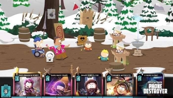 South Park: Phone Destroyer – карточная игра по одноименному мультфильму. По сюжету, детишки решили поиграть в индейцев и ковбоев, хотя не всем персонажам Южного Парка эта идея пришлась по душе. Геймер перевоплощается в Новичка и начинает путешествие по улицам игрового города, который поделен на эпизоды. В каждом из них – 5 сражений, для которых вызываются персонажные карточки. От умения подобрать сбалансированный набор карточек зависит исход поединка, каждая карта отличается особыми характеристиками (урон, здоровье или класс). Большинство героев имеет оригинальные умения – клич Джеронимо, Прости Кенни, Аура, Последнее желание.