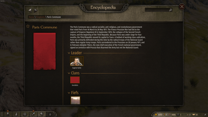 Неплохо укомплектованная армия Пруссии атаковала Париж, захватила его, начала навязывать свои порядки, и использовать город в качестве колонии. Из-за этого правительство сменило столицу на Тур. Из войск, старающихся хоть как-то противодействовать прусской армии, остались лишь члены социалистической национальной гвардии. В ходе долгих демократических переговоров был достигнут мир с Пруссией. Но взамен французская армия Mount & Blade 2: Bannerlord - la Commune de Paris должны была разоружиться, остались лишь отряды Garden Nationale. Такое решение пришлось по душе далеко не всем, 18 марта 1871 года пролетариат создает Парижскую Коммуну под протекторатом Национальной гвардии. Не без того ослаблена войной с Пруссией Франция разобщена, по сути, на два отдельных государства, противодействующих между собой.