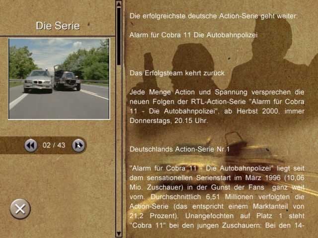 Alarm for Cobra 11: The Autobahn Patrol RUS Полная версия Последняя Дата выхода 2003 Разработчик VCC Entertainment Жанр Экшены, Гонки, Аркады Обновлено 26 января 2025, 11:13 Список изменений В Alarm for Cobra 11: The Autobahn Patrol игрок возьмет на себя управление элитным бойцом отряда Кобра 11. Он – профессиональный водитель, который будет следить за порядком на дорогах. В финале карьеры у протагониста будет 24 гоночных автомобиля. Доступен локальный многопользовательский режим для 2 игроков. Одиночная кампания начинается в аэропорту. Черный фургон преследует колонна из 3 полицейских и 2 пожарных машин. Действия разворачиваются в Германии. Террористам за рулем фургона удалось выехать на взлетно-посадочную полосу и врезаться в самолет, из-за чего тот взорвался. После приветственного внутриигрового видео в Alarm for Cobra 11 The Autobahn Patrol главный герой оказывается за рулем машины на улице немецкого города. Ему дают задание срочно выехать в офис. На экране есть стрелка, показывающая, сколько метров осталось до пункта назначения. Для завершения задания нужно припарковаться на красном маркере. Помогает ориентироваться в городе мини-карта, а контролировать скорость – спидометр. Для успешного прохождения важно ездить максимально быстро, ведь часто дают всего 60 секунд, чтобы преодолеть несколько км. При этом врезаться в столбы, заборы, постройки и другие авто нельзя, это повлияет на техническое состояние машины. Нарушать другие правила дорожного движения разрешается. Чем быстрее доберется в пункт назначения герой, тем больше звезд он получит. Скачать торрент Скриншоты Показать больше Скачать Alarm for Cobra 11: The Autobahn Patrol Тип релиза Лицензия (Таблетка: Не требуется) Версия (Полная) Последняя Размер 572.8 МБ Интерфейс Русский Озвучка Русская Порядок установки: Скачать .torrent торрент файл Скачать БЕЗ торрента прямая ссылка через uTorria Системные требования ОС: 2000SP4/XPSP1 Процессор: Pentium IV/AMD Athlon XP, 1.5 ГГц Оперативная память: 256 МБ Видеокарта: 64 МБ Место на диске: 600 МБ Ретро, Олдскул