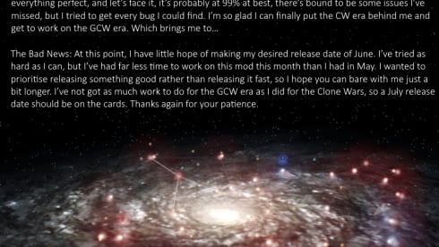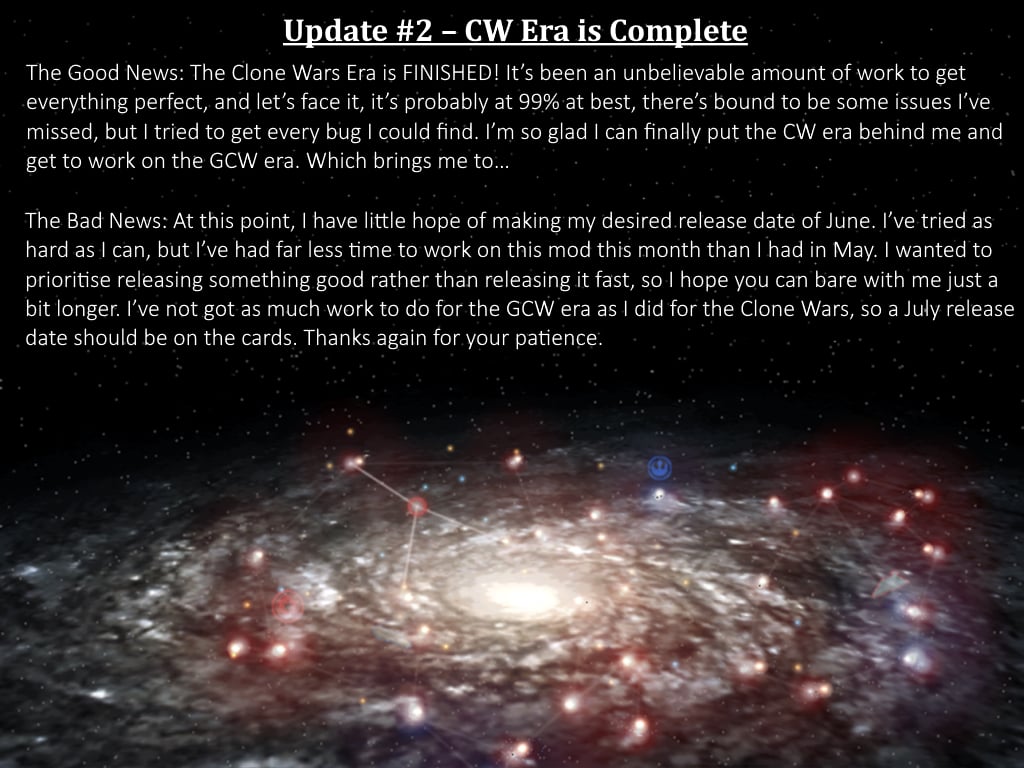 В ранних частях это серии был режим, что превращал игры в пошаговые стратегии. В ремейках официальные разработчики от него отказались. Тогда одни любители создали свой продукт, а затем другие энтузиасты его доработали. Так появился Star Wars: Absolute Battlefront - Galactic Conquest, что меняет геймплей. Особое внимание было уделено эпохе Войн Клонов. Конфедерация независимых государств получила 12 играбельных героев, а Республика – 17.