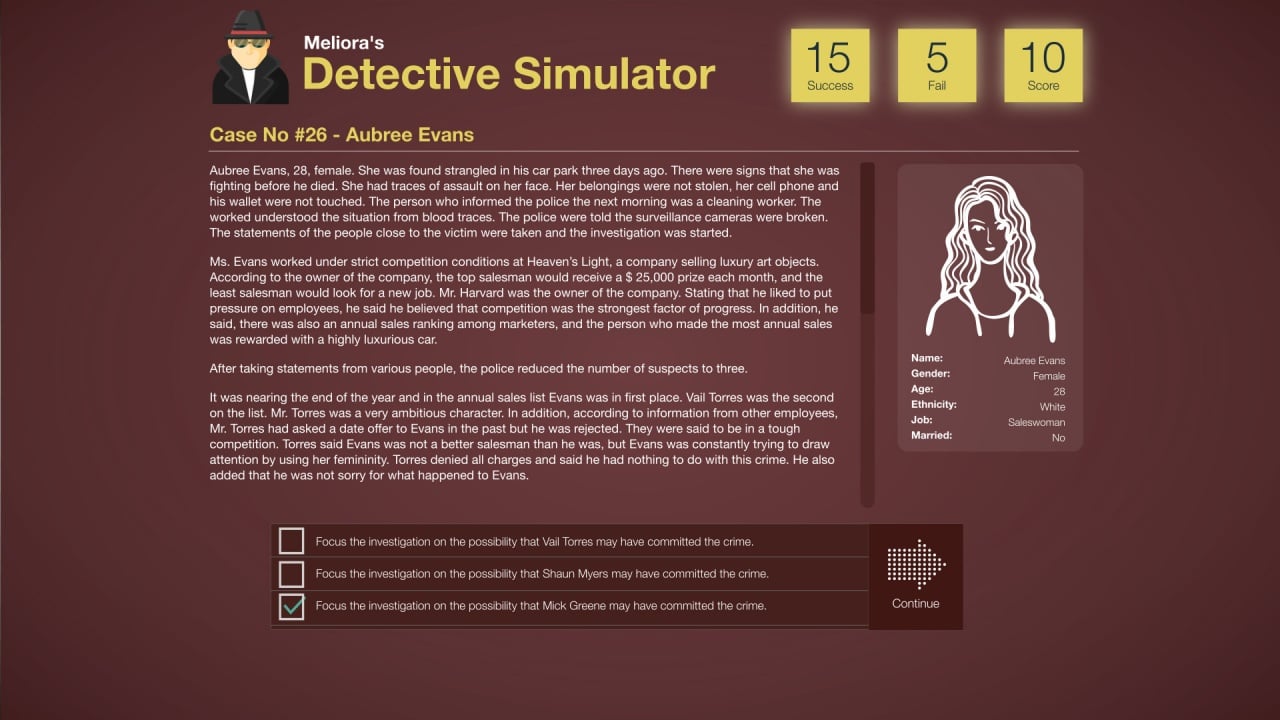 Meliora’s Detective Simulator RUS Дата выхода Скоро выйдет Разработчик Miraoriem Жанр Инди, Симуляторы, Стратегии, Приключения, Визуальная новелла Торрент ожидается Добавьте в избранное, чтобы следить Meliora’s Detective Simulator – это минималистический текстовый квест, где пользователю предстоит опираться только на словесные показания и описания, чтобы найти виновного. Опросы подозреваемых, осмотр улик могут практически не дать никаких видимых улик, но выбрать козла отпущения все же нужно и стоит не ошибаться. Ведь если серийный убийца останется на свободе, а вместо него сядет не тот человек это только сильнее убедит его в безнаказанности. Главный герой – опытный частный детектив, которому довольно часто поступают интересные дела. И только он может помочь заказчику разобраться в произошедшим преступлением. Это не обязательно должно быть убийство или похищение, нередко бывают украдены ценные предметы или украшения и найти их определенно необходимо, как и самого воришку, чтобы он получил соответствующее наказание. Для того чтобы не запутаться во всех допросах, героев можно распределять по определенным сторонам и признакам, которые совпадут с тем, что сказала жертва. В алиби каждого подозреваемого также стоит убедиться, так как путаница в своем же вранье способна выдать виновного. В Мелиорас Детектив Симулятор пользователя ожидает более 50 увлекательных детективных историй. В случае, если в процессе расследования будет допущена ошибка, игра может немного помочь и дать короткие подсказки, что вытащат из тупикового случая. Также можно выбирать уровни сложности, от которых зависит то, насколько искусным и внимательным будет преступник и какое количество людей даст ложные сведения. Скачать торрент Скриншоты Показать больше Скачать БЕЗ торрента прямая ссылка через uTorria Системные требования ОС: 7, 8, 10 Процессор: 2 GHz - Dual Core Оперативная память: 2 ГБ Место на диске: 100 МБ Насилие, Детектив, Криминал, Решения с последствиями, Атмосферная, Глубокий сюжет, Отличный саундтрек, Тайна