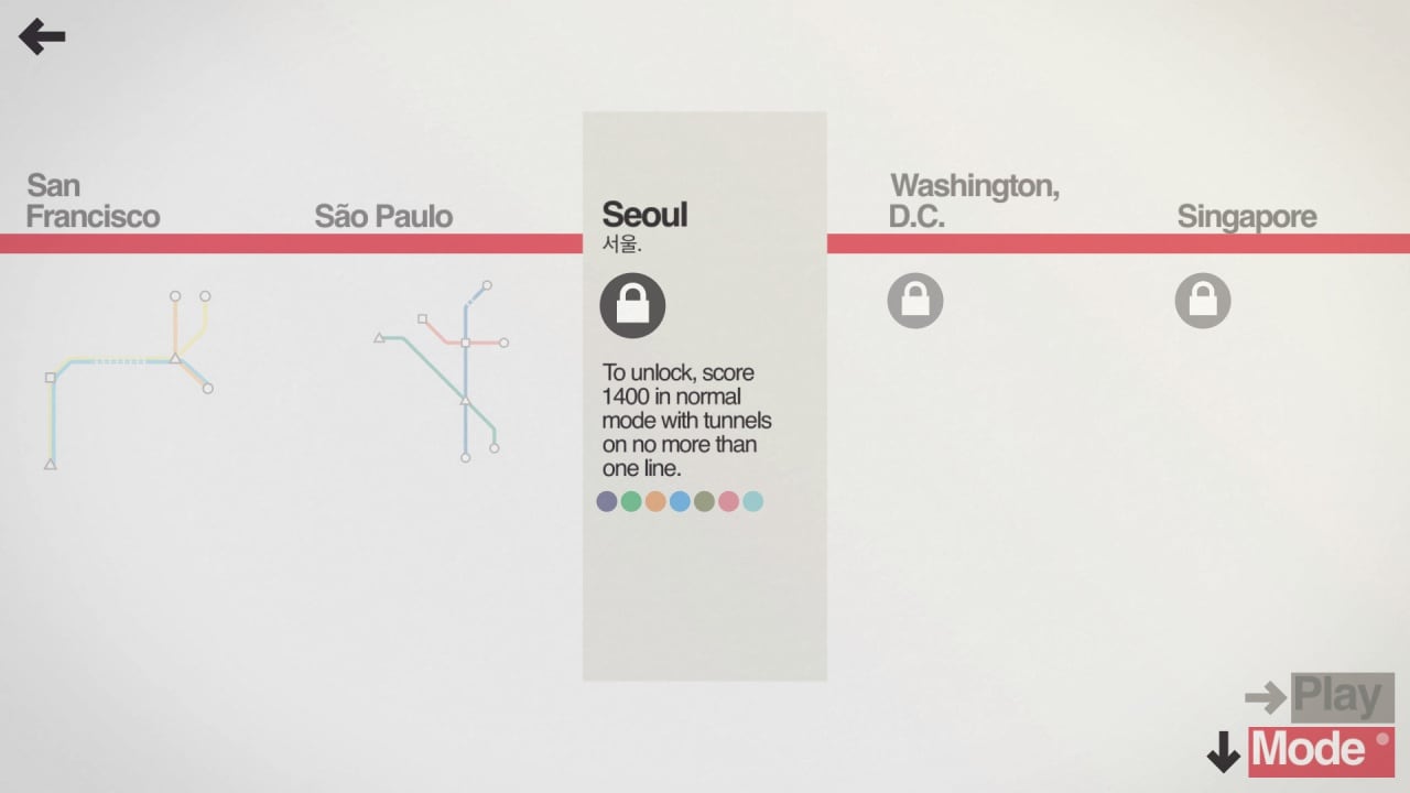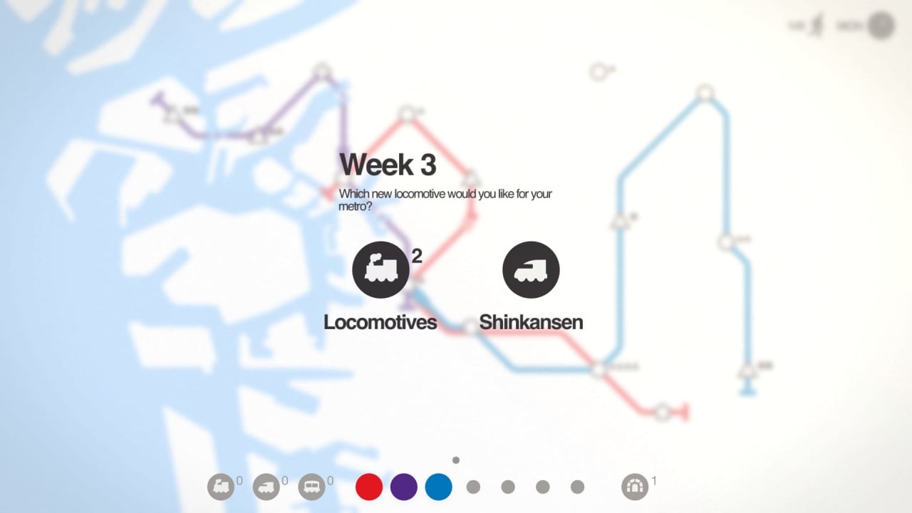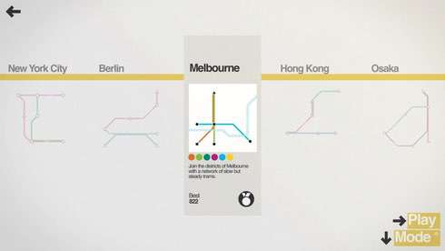Создавайте и развивайте собственную сеть метро в Mini Metro. Город растет, как и количество людей, поток которых перегружает станции. Геймер создает ветки метро между подстанциями, рисуя горизонтальные, вертикальные, диагональные линии, где начинают ездить транспортные средства. Ветки дорог пересекаются исключительно в узлах станций либо под прямым углом. Платформы в игре изображены в качестве пустых квадратов, треугольников, звезд, способных вместить конкретных клиентов. Люди представлены также в виде фигур, которые соответствуют подстанциям.