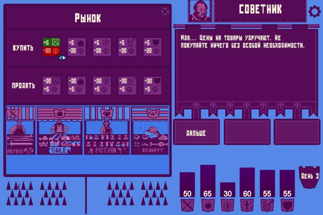 Создание крепкого королевства требует правильного управления ресурсами. Для этого нужно перераспределять армии, еду, внутриигровую валюту – золото, веру. Делать все возможное, чтобы счастье и здоровье населения было на высоте. Присутствуют мини игры, позволяющие разнообразить прохождение. В KingSim есть несколько разных концовок – узнать все можно только после нескольких прохождений.