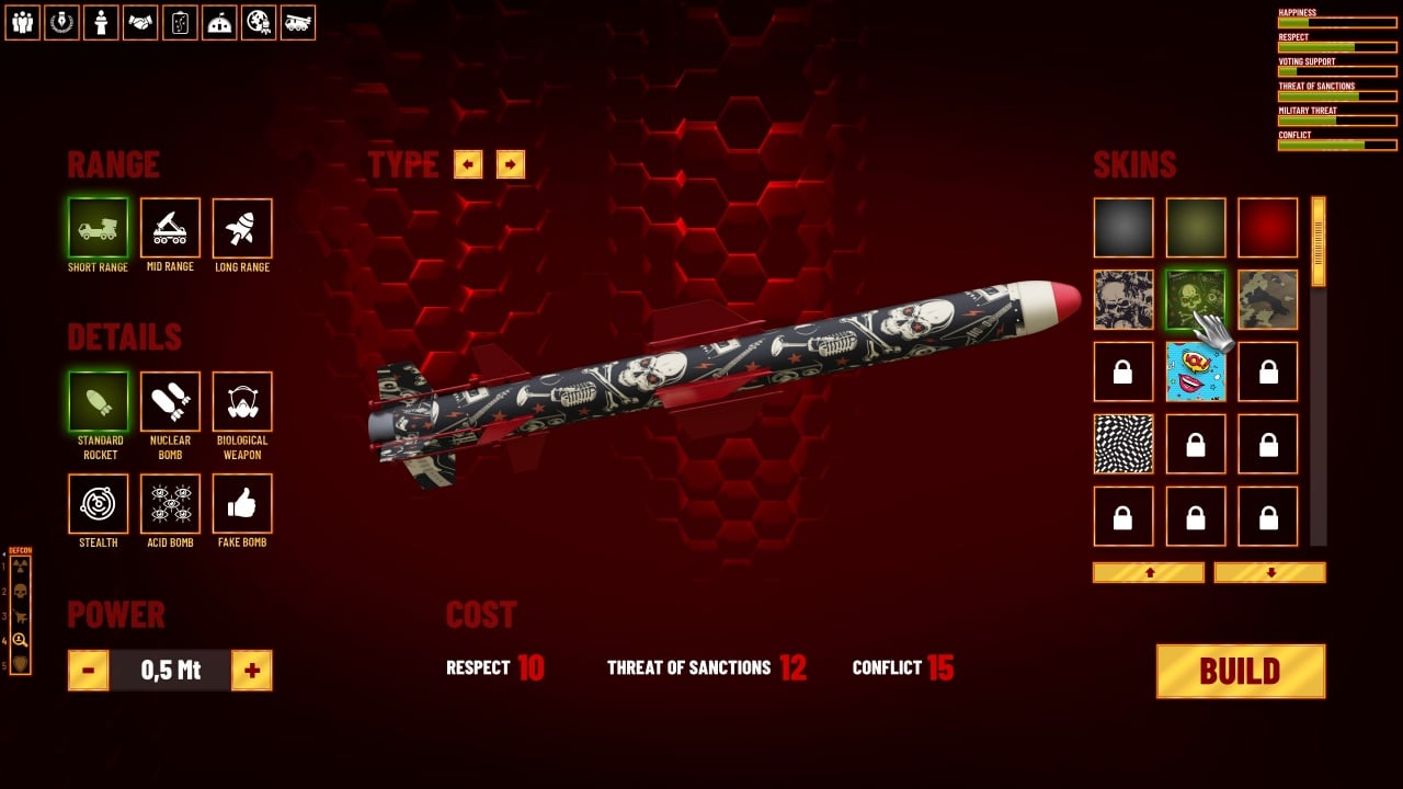 I am Dictator RUS Дата выхода Ещё не объявлена Разработчик Hypernates Жанр RPG, Стратегии, Симуляторы Торрент ожидается Добавьте в избранное, чтобы следить Игра I am Dictator позволит ощутить себя автократическим лидером государства. Авторитет правителя настолько высок, что его уважают самые могущественные страны мира. Заботясь о моральном духе своей армии и народа, пользователю предстоит защищать родину от атак враждебных сверхдержав. Для этого потребуется задействовать все доступные силы, чтобы показать, что интервенция будет жестко покарана. В I am Dictator придется активно заняться строительством индустриальных предприятий, улучшать военные технологии и международную обстановку. Попутно нужно разрабатывать передовые ракеты, а также развивать науку в целях обойти возможных противников. Одновременно нужно принимать решения, которые непосредственно повлияют на отношения между диктаторским государством и остальным миром. В игре есть сюжет, насыщенный случайными событиями, которые не будут терпеть отлагательств. В процессе также придется самостоятельно разрабатывать тактику поведения на международной арене. Огромную роль играет соблюдение баланса между военными действиями и дипломатией, чтобы не спровоцировать масштабную войну. Но это не значит, что нужно расслабиться, ведь враги только этого и ждут, так что кроме всего вышеперечисленного, не лишним будет поддерживать моральный дух своих граждан. Советами помогут личные советники, которые обязательно сообщат о результатах произведенных действий и лучше к ним прислушиваться во избежание неприятностей. Скачать торрент Скриншоты Показать больше Видео из игры Скачать БЕЗ торрента прямая ссылка через uTorria Системные требования ОС: 7, 8, 10 (64-bit) Процессор: Intel Core i3 3.0 GHz Оперативная память: 8 ГБ Видеокарта: GeForce GTX 970 Место на диске: 25 ГБ Градостроение, Глобальные стратегии, Ролевые стратегии, Пошаговые стратегии, Пошаговая тактика, Политический симулятор, Военные конфликты, Игры в 2D, Строительство, Тактика, Война, Военные действия, Строительство базы, Пошаговые сражения