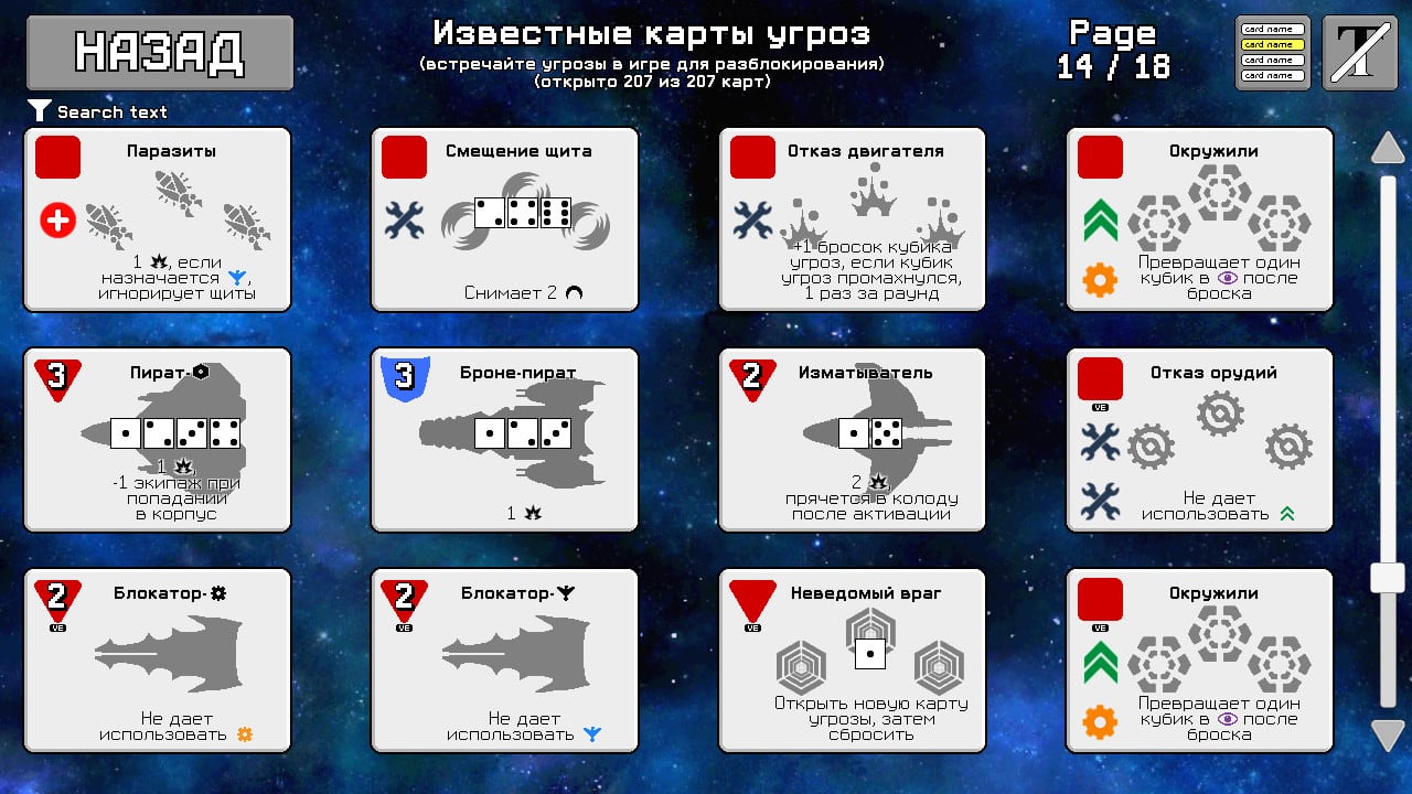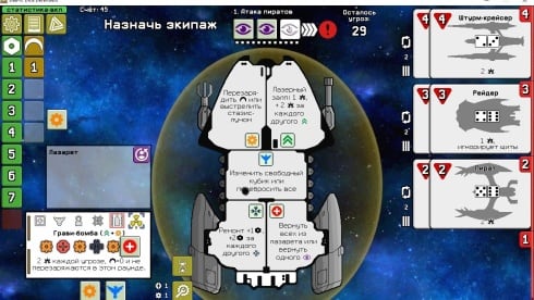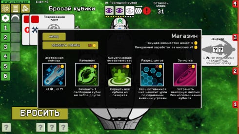 Dee-6: Dice Defenders RUS v 1.0 Новая версия Полная версия Последняя Дата выхода 31 мар. 2021 Разработчик KBA3u's factory Жанр Симуляторы, Стратегии, Инди В основном положительные на основе 45 обзоров в Steam 73% Обновлено 1 апреля 2025, 06:01 Список изменений Dee-6: Dice Defenders отправляет геймера бороздить космическими просторами, применяя стратегические навыки, которые пригодятся в ходе игрового процесса. Есть возможность стать командиром тех, кто находится на борту орбитального корабля. Экипаж полностью управляемый. Главнокомандующим является игрок, которому стоит следить за многими факторами. Последние очень нужны команде. Игра представлена в настольном виде, где присутствуют специальные кубики-солдаты с максимальным значением — 6. От этого зависит следующий ход командира. Можно будет стрелять лазерными пушками, использовать щиты в качестве защиты, ремонтировать определенные участки судна, восстанавливать членов экипажа. Повсюду игрока ждут угрозы. Ими могут быть пиратские захваты, астероидная атака, вторжение инопланетной расы, туманность и другие виды опасностей. В Dee-6: Dice Defenders их присутствует свыше 200 единиц. Есть возможность проходить разноплановые миссии, в ходе которых можно раздобыть различные космолеты, отличающиеся стилем управления и характеристиками. Можно будет поиграть в сюжетную кампанию или пройти случайное противостояние. В ходе прохождения придется зарабатывать игровые монеты и очки, которые будут служить результатом. Необходимо продумать тактику, чтобы добиться лучшего.Часть угроз, которые будут сопровождать во время геймплея: Паразиты – игнорируют наставленные щиты. Отказ двигателя – бросок с дополнительной опасностью. Окружили – превращение кубика. Пират – уничтожает экипаж, который находился в указанном корпусе. Блокатор – не дает использовать определенные элементы. Скачать торрент Скриншоты Показать больше Видео из игры Скачать Dee-6: Dice Defenders Тип релиза Пиратка (Таблетка: Не требуется) Версия v 1.0 (Полная) Последняя Размер 91.63 МБ Интерфейс Русский Озвучка Отсутствует Скачать .torrent торрент файл Скачать БЕЗ торрента прямая ссылка через uTorria Системные требования ОС: Windows 7, 8, 10 Процессор: AMD A6-6400K APU 3.9 GHz Оперативная память: 2 ГБ Видеокарта: Intel HD 3000 Место на диске: 100 МБ Пошаговые стратегии, Пошаговая тактика, Карточная игра, Головоломка, Игры в 2D, Полёты, Тактическая RPG, Вид сверху, Цветастая, Минимализм, Пиксельная графика, Набор очков, Процедурная генерация, Решения с последствиями, Управление ресурсами