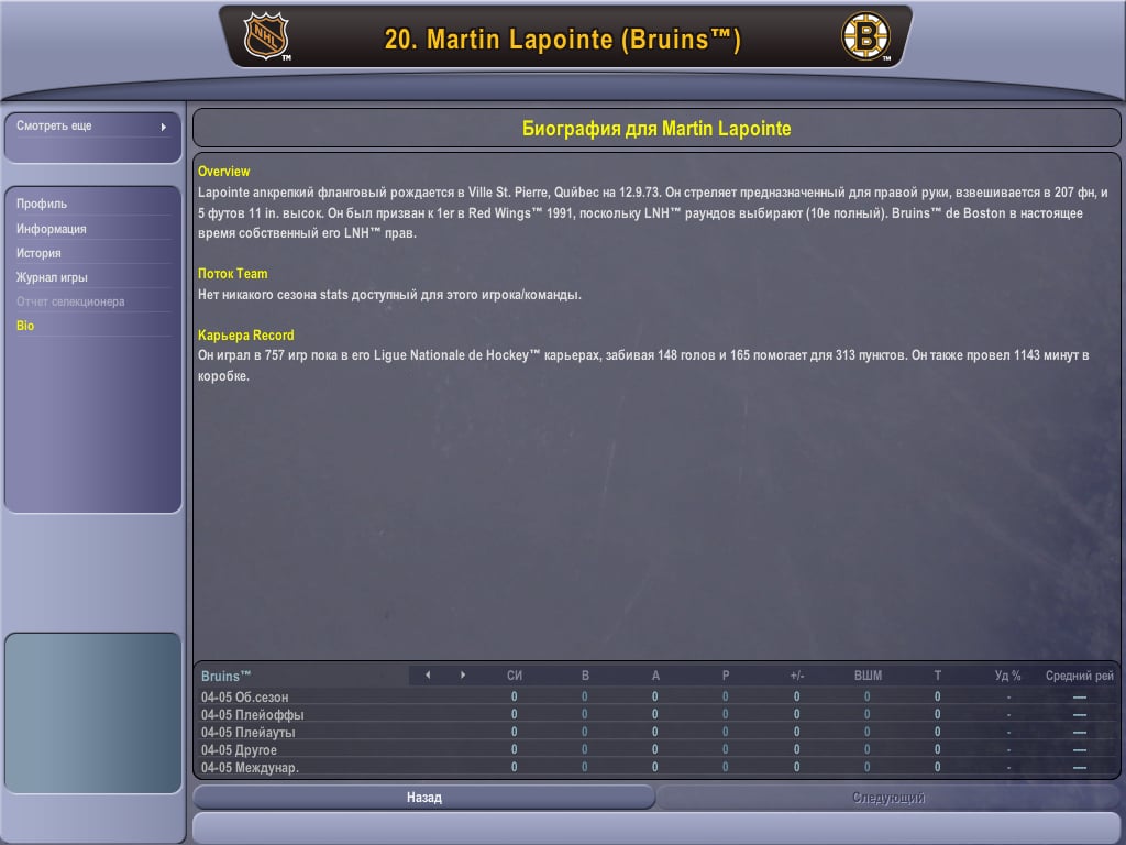 NHL Eastside Hockey Manager 2005 RUS Полная версия Последняя Дата выхода 2005 Разработчик Sports Interactive Limited Жанр Симуляторы Обновлено 26 января 2025, 10:43 Список изменений NHL Eastside Hockey Manager 2005 определенно была создана для ярых фанатов хоккея и тактик, с ним связанных. Так как пользователю предстоит стать не спортсменом, который за счет своих сил приведет команду к победе, а ее менеджером. На его плечах довольно много обязанностей, который всегда остаются в тени для обычного зрителя, но именно их успешное выполнение и предопределяет успешность исхода матчей. Игрок может создать свою собственную команду мечты из наиболее популярных хоккеистов клубов 2005 г или взять уже сформированный отряд и начать вести его к победе от самых низов. Главным нововведением этой части является наличие тренировочных лагерей, где можно подготовиться к предстоящему сезону и отработать несколько приемов на противостоянии другим спортсменам, которые прибыли перенять уникальный опыт. Также пользователю необходимо будет заниматься и экономическими вопросами по типу привлечения спонсоров, траты на снаряжение своих подопечных, как на периоды соревнований, так и тренировок. От качества вещей, клюшек, коньков и прочего во многом зависит скорость передвижения и точности ударов. Хоккейный менеджер 2005 выполнен в минималистической двухмерной графике, с помощью которой игрок может наблюдать за происходящим на поле, и в случае необходимости, корректировать планы и стратегии. Противостоять ему будет разумный искусственный интеллект, способный предугадывать очевидные ходы. Так что чем больше непредсказуемости, но при этом организованной, тем больше вероятность позитивного исхода. Скачать торрент Скриншоты Видео из игры Скачать NHL Eastside Hockey Manager 2005 Тип релиза Пиратка (Таблетка: Не требуется) Версия (Полная) Последняя Размер 262.1 МБ Интерфейс Русский Озвучка Отсутствует Порядок установки: Скачать .torrent торрент файл Скачать БЕЗ торрента прямая ссылка через uTorria Системные требования ОС: 98 SE / ME / 2000 / XP / Vista / 7 Процессор: Pentium III 1 ГГц Оперативная память: 128 МБ Видеокарта: 64 МБ Место на диске: 260 МБ Спортивные, Атмосферная, Классика, Менеджмент, Ретро, Олдскул