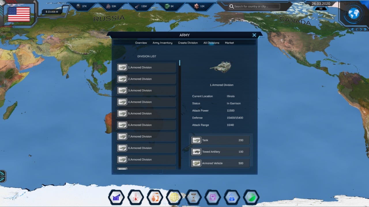 В наличии возможность улучшать армию. Можно приобретать минералы и заказывать вооружение для войск. Тут позволяют вмешиваться во внутренние дела иных держав. Можно надавить на них и даже запугать. Однако при этом стоит учитывать реакцию 7 крупных международных организаций. Можно вводить эмбарго, засылать агентов и устраивать саботажи, организовывать контрразведку и пытаться предотвратить теракты. Никто не запрещает разбираться с проблемами силовым путем. Сражения тоже проводятся в реалтайме. Есть наземная техника, авиация и флот. Также здесь есть висящие на орбите спутники.