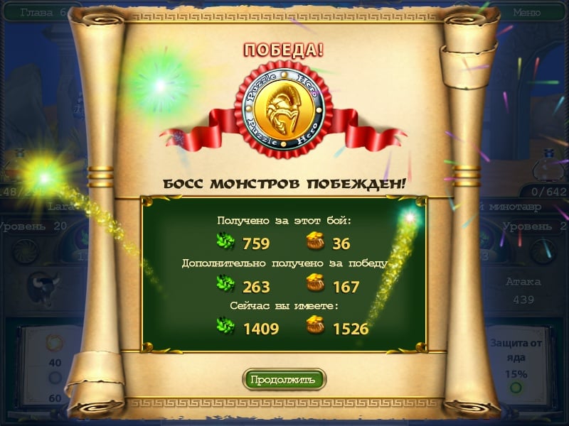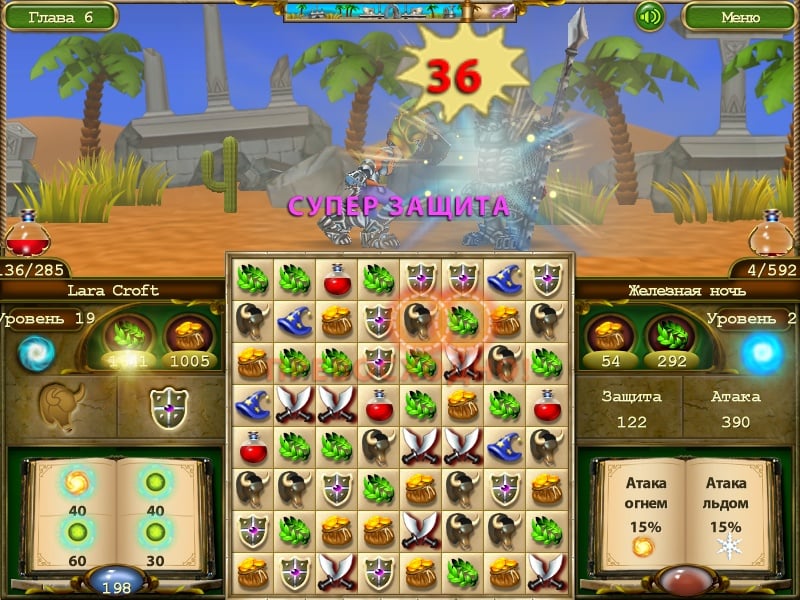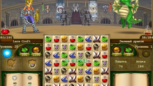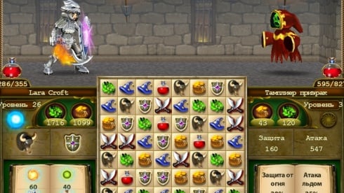 Игрокам доступны различные комбинации во время сражений, где нужно подбирать и продумывать цепочки длинных комбинаций и вариантов, для максимального результата, очищая и опуская элементы вниз. Главной задачей выступает полная зачистка поля или выполнение необходимой нормы, набирая очки, чтобы перейти к следующей локации и новым испытаниям. Процесс выполнен на экране, где видно схватку между героем и его противником, которые участвуют в бою.