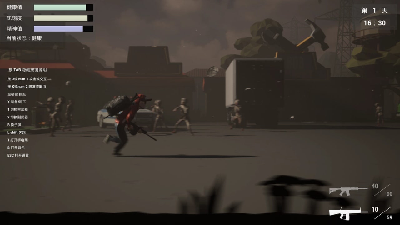 На интерфейсе юзер может увидеть текущее оружие, оставшиеся боеприпасы, потребность в пище, воде и отдыхе. Двигаясь, сражаясь и взаимодействуя с миром, персонаж устает. Сон или продовольствие помогает восстановить счетчик "стамины". Представлен обширный арсенал, включающий огнестрельное оружие: автоматические винтовки, пистолеты, дробовики и пистолеты-пулеметы. Имеются и острые предметы, но они тратятся больше энергии и наносят меньше урона по врагам.