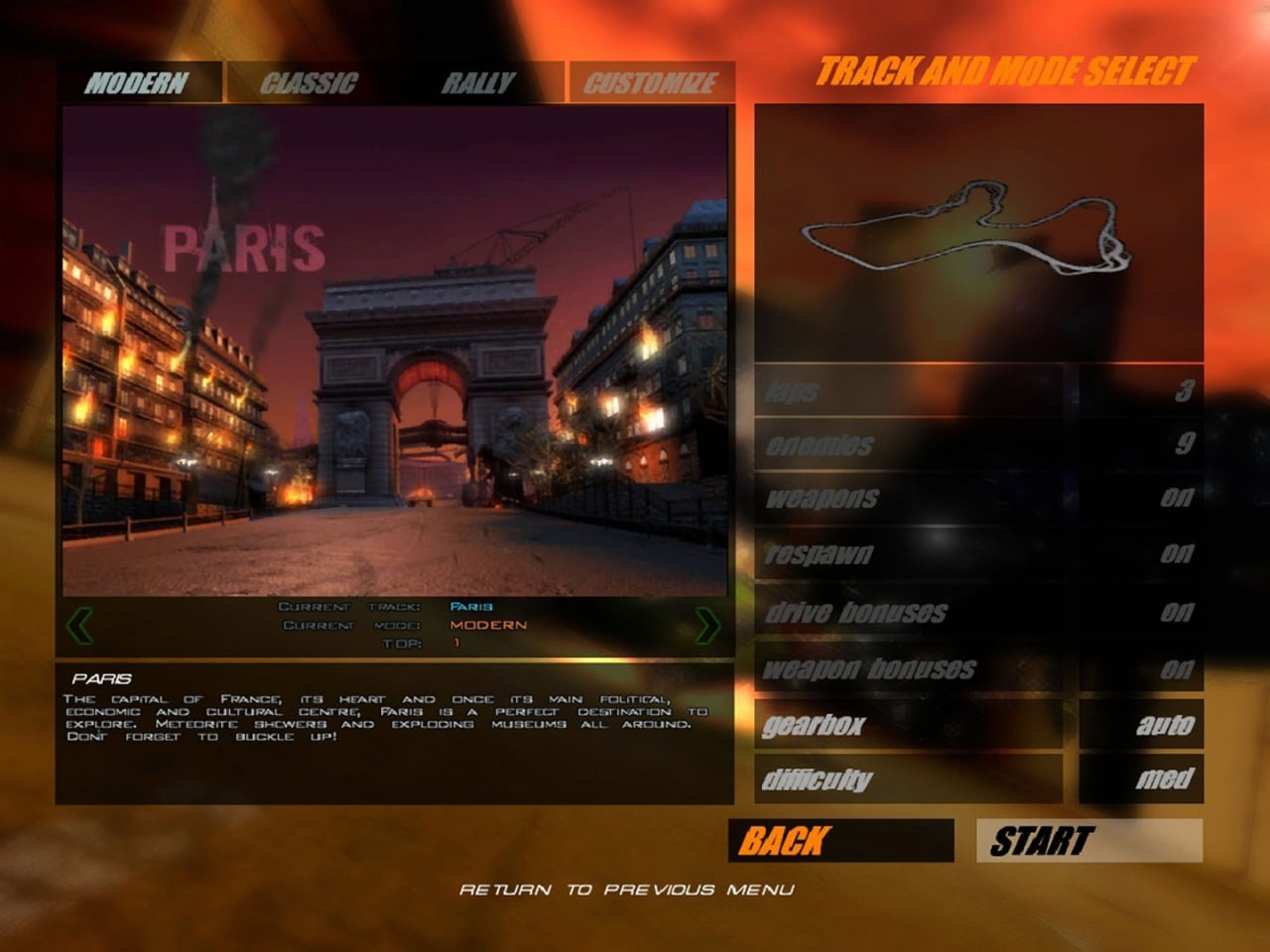 В гараже находится 10 футуристических болидов, отличающихся между собой характеристикой и внешним видом. Они подвергаются модернизации и смене вооружения. Юзер может тюнинговать, улучшать двигатель, коробку передач или обшивку. Перед заездом можно выбрать 3 из 7 видов оружия. Пушки получаются за деньги, а средства зарабатываются в гонках. Побеждает тот, кто первым доберется до финиша. Если машина персонажа разрушается, то можно начать заново или появится в том же месте через несколько секунд с нулевой скоростью.