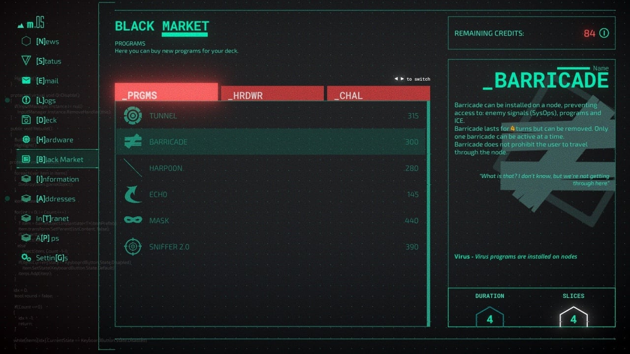 Игра представлена в виде уровней на цифровом пространстве, где предстоит решать разнообразные пошаговые головоломки и задачки, помогающие обходить защиту программного обеспечения. Приходиться постоянно отслеживать новинки черного рынка и приобретать улучшенное программное обеспечение, чтобы более удачно вскрывать сложные пароли и выполнять трудные, поставленные перед героем задания.