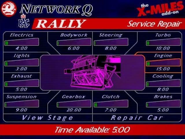 Суть гонок в Network Q RAC Rally Championship состоит в том, чтобы добраться от старта до финиша как можно быстрее. При этом нужно стараться аккуратно обходить соперников и ни во что не врезаться. С поломками можно разобраться в перерывах между заездами. Однако на этот процесс дают мало времени, и починить всё в побитой после аварий машине не выйдет. Повреждения частично отображаются на транспорте визуально. Тут даже показываются трещины на стеклах.