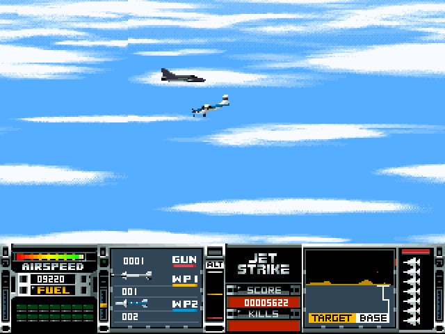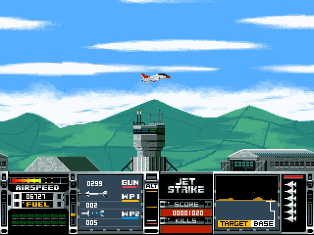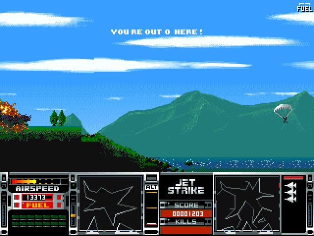 Воздушное судно можно разбить, если врезаться в какое-нибудь препятствие или поймать вражеский снаряд. Дополнительные жизни в Jetstrike реализованы нетипичным способом. Перед уничтожением транспортного средства пилот катапультируется. А затем он получает новый истребитель или самолет. Количество попыток ограничено, что в самой игре объясняется высокой стоимостью техники. Если потерять все летательные аппараты, то героя отправят доучиваться в летное училище. По сюжету персонаж борется с глобальной организацией SPUDD. Она помогает своим марионеткам стать главами государств, совершает теракты по всему миру, занимается распространением наркотиков и другими преступлениями. Спецслужбы стран со всего мира объединяют усилия, чтобы дать отпор преступной группе. Они делают ставку на опытного лётчика.