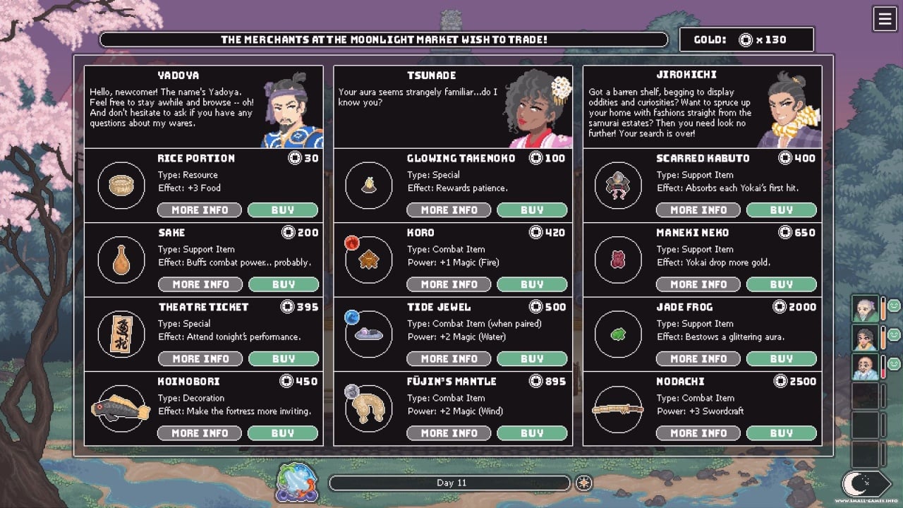В дневное время необходимо сделать все возможное для подготовки к бою. Управляя местными жителями, требуется собирать ресурсы, укреплять здание, крафтить оружие и т.д. Грамотное руководство позволяет тщательно подготовиться к бою и придумать тактику защиты. На лунном рынке можно покупать ресурсы и различные улучшения. Всего доступно 20 уникальных жителей и порядка 100 случайных событий. Вместе со своими бойцами требуется пережить 6 полнолуний, после чего удастся устранить угрозу со стороны врагов. Контент и особенности Yokai Moon: