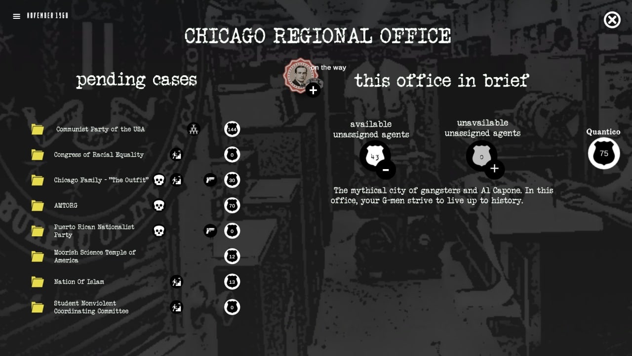Jey's Empire Дата выхода 15 окт. 2019 Разработчик Maestro Cinetik Жанр RPG, Стратегии, Симуляторы, Инди Очень положительные на основе 59 обзоров в Steam 86% Торрент ожидается Добавьте в избранное, чтобы следить Готовы ли Вы в Jey's Empireпротивостоять крупным мафиози и их бандам, не побоитесь ли Ку-клукс-клана и организованной преступности, что активно просачивается между законами и порядком. Главный герой – директор ФБР Джон Эдгард Гувер, является реальным человеком, возглавившим Федеральное бюро расследований в 26 лет (1935 г). Он занимал эту должность порядка десяти лет и вошёл в историю как один из самых влиятельных и противоречивых фигур в США. Действие Jey's Empire разворачивается в 60-х годах, как раз в то время, когда была убита Мэрилин Монро и совершенно самое громкое заказное кровопролитие Джона Фицджералда Кеннеди. В меню перед тем, как начать основную игру, можно пройти небольшое обучение. В котором персонаж сидит за столом, сзади него флаг Соединенных Штатов Америки и Бюро, а на столе лежит карта со всеми отмеченными штатами великого государства. Далее звонит телефон и человек на проводе представляется как Maestro Cinetik, автор произведения и объясняет основные механики и основы прохождения. Всего доступно шесть сценариев с разным уровнем сложности, основными событиями, правонарушениями и временным отрезком. Основная цель – не уволится и оставаться у власти до финальных сцен кампании. Сначала герой получает телефон, секретные файлы и карту. На последней отображаются опасности исходящие от разных групп населения. После чего необходимо выделить отряд из агентов для их нейтрализации. Но для того, чтобы удачно завершить дело, надобно изучить информацию: степень тяжести, активность, насилие, размер, угроза и другие. Периодически придется взаимодействовать и общаться с другими юнитами, и от решений выбранных реплик, будет зависеть доверие и уверенность в капитане. Если они дойдут до нуля, протагонист лишится работы. Скачать торрент Скриншоты Показать больше Видео из игры Скачать БЕЗ торрента прямая ссылка через uTorria Системные требования ОС: XP, 7, 8, 10 (32/64-bit) Процессор: 1.5 Ghz (Intel Celeron / AMD Athlon 64 x2) Оперативная память: 4 GB Видеокарта: DX9 Место на диске: 250 МБ Выбери себе приключение, Менеджмент, Политический симулятор, Ролевые стратегии, Пошаговые стратегии, Глобальные стратегии, Война, Историческая, Point and click, Решения с последствиями, Атмосферная, Глубокий сюжет