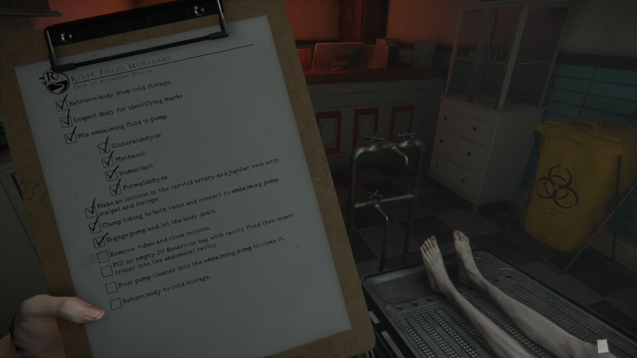 Мрачная атмосфера в The Mortuary Assistant погружает в деятельность сотрудника морга, занимающегося рутинной работой. Главный герой прибывает на представленную должность в Ривер Филдс, чтобы обучаться и получать трудовой опыт. Наставником выступает человек по имени Морттик, который помогает разобраться в тонкостях повседневных задач и рассказывает про правильное бальзамирование трупов, а также про уход и качественное обращение с телами умерших людей.