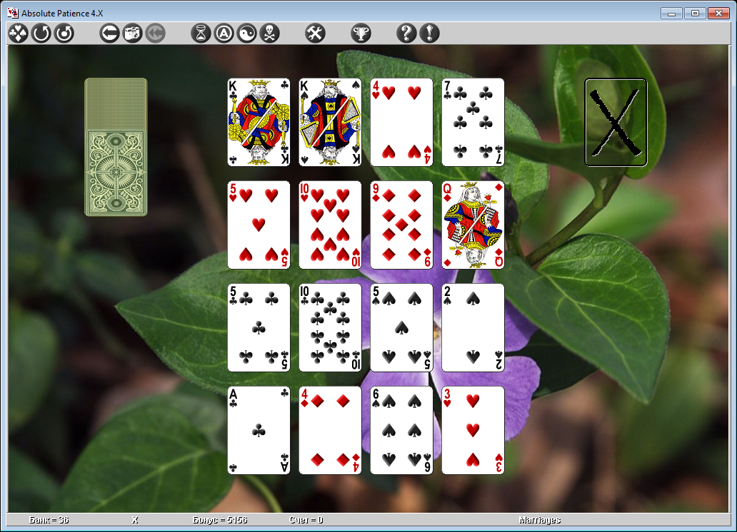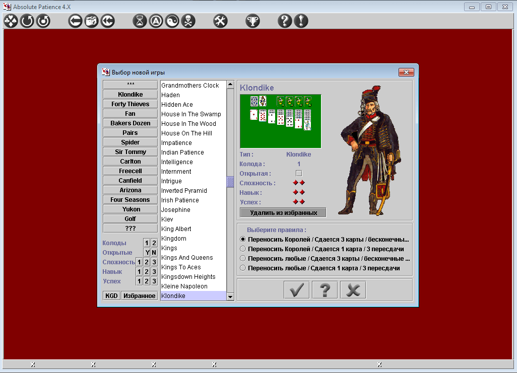 Absolute Patience 4.Х - сборник пасьянсов, включающий в себя порядка 420 игр. Представлены как классические виды настолок, такие как Klondike, Freecell, Spider, Yukon, Gaps и множество других, а также разные современные вариации. В общем сборник Абсолютный пасьянс 4Х дает возможность сыграть в 640 вариантов известнейшей настолки. Коллекция может быть интересна как профессиональным игрокам, так и новичкам пасьянс-игр. Содержится встроенный помощник, анализирующий действия.